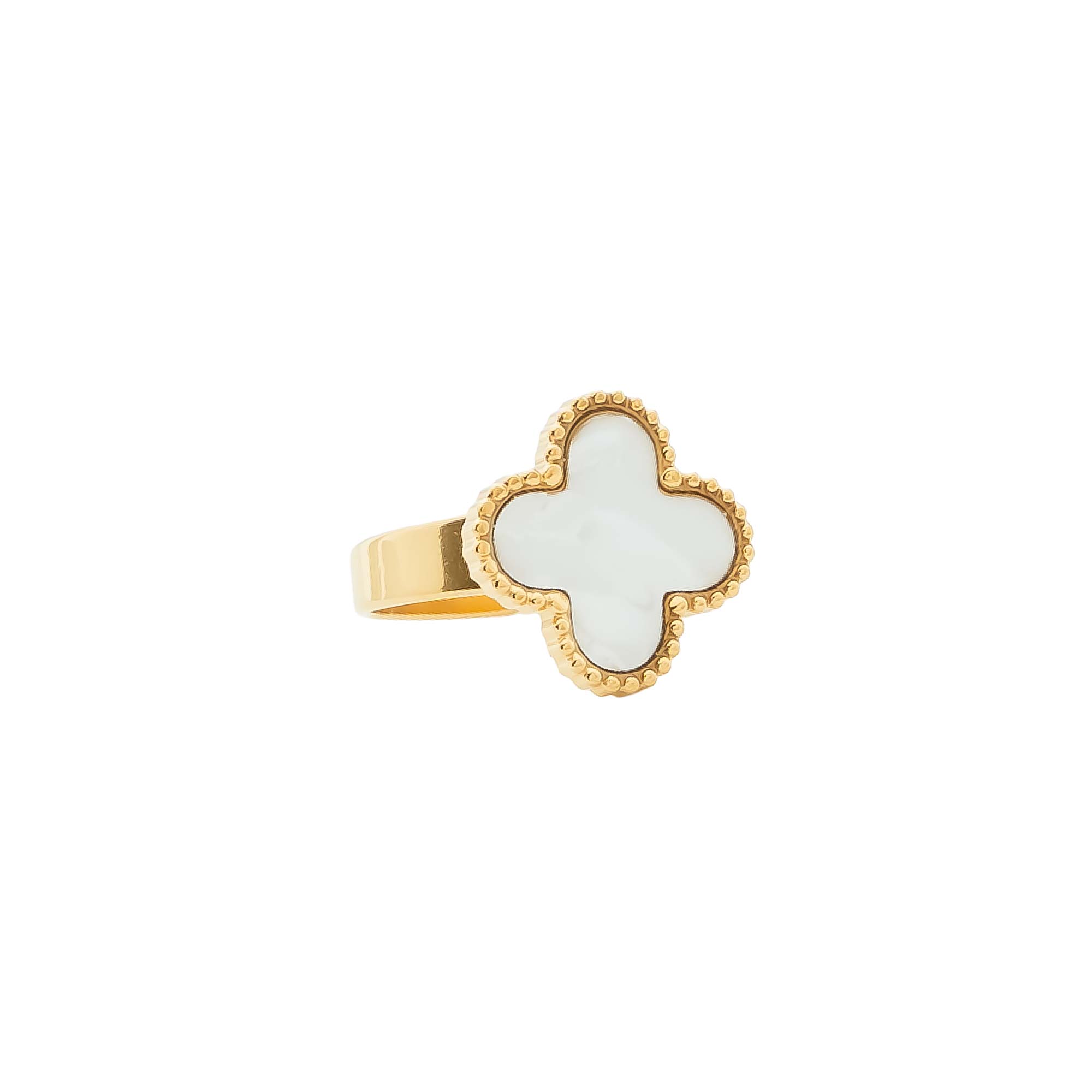 Add to WishlistElegante anillo con un diseño clásico de trébol de cuatro hojas. El motivo central presenta un brillante centro de nácar blanco iridiscente, enmarcado por un delicado borde perlado. La banda lisa y pulida complementa el diseño sofisticado. Un accesorio atemporal y lleno de simbolismo, perfecto para añadir un toque de suerte y distinción a tu mano.