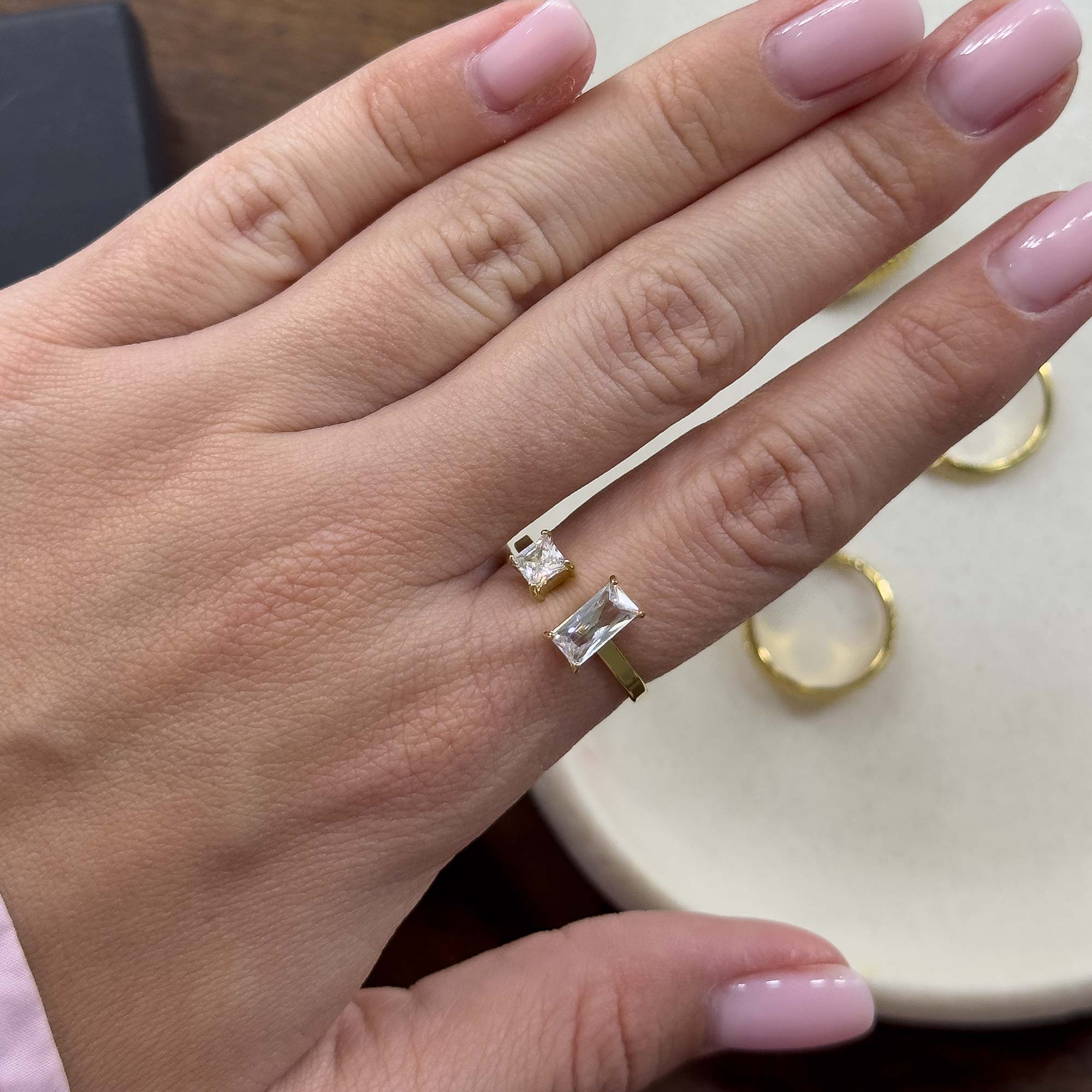 Add to WishlistEste anillo presenta dos circonitas de corte geométrico una cuadrada y otra rectangular que parecen flotar sobre el dedo. Es una joya que equilibra la delicadeza con un brillo impactante, ideal para añadir un toque de luz tanto a looks diarios como a estilismos más formales. Una elección atemporal para quienes valoran los detalles sutiles pero memorables.