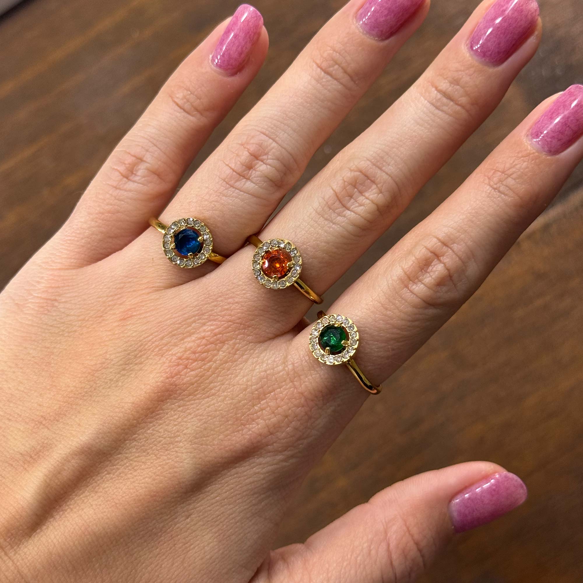 Anillo con circonita central rodeada de pequeñas circonitas, elegante y luminoso.