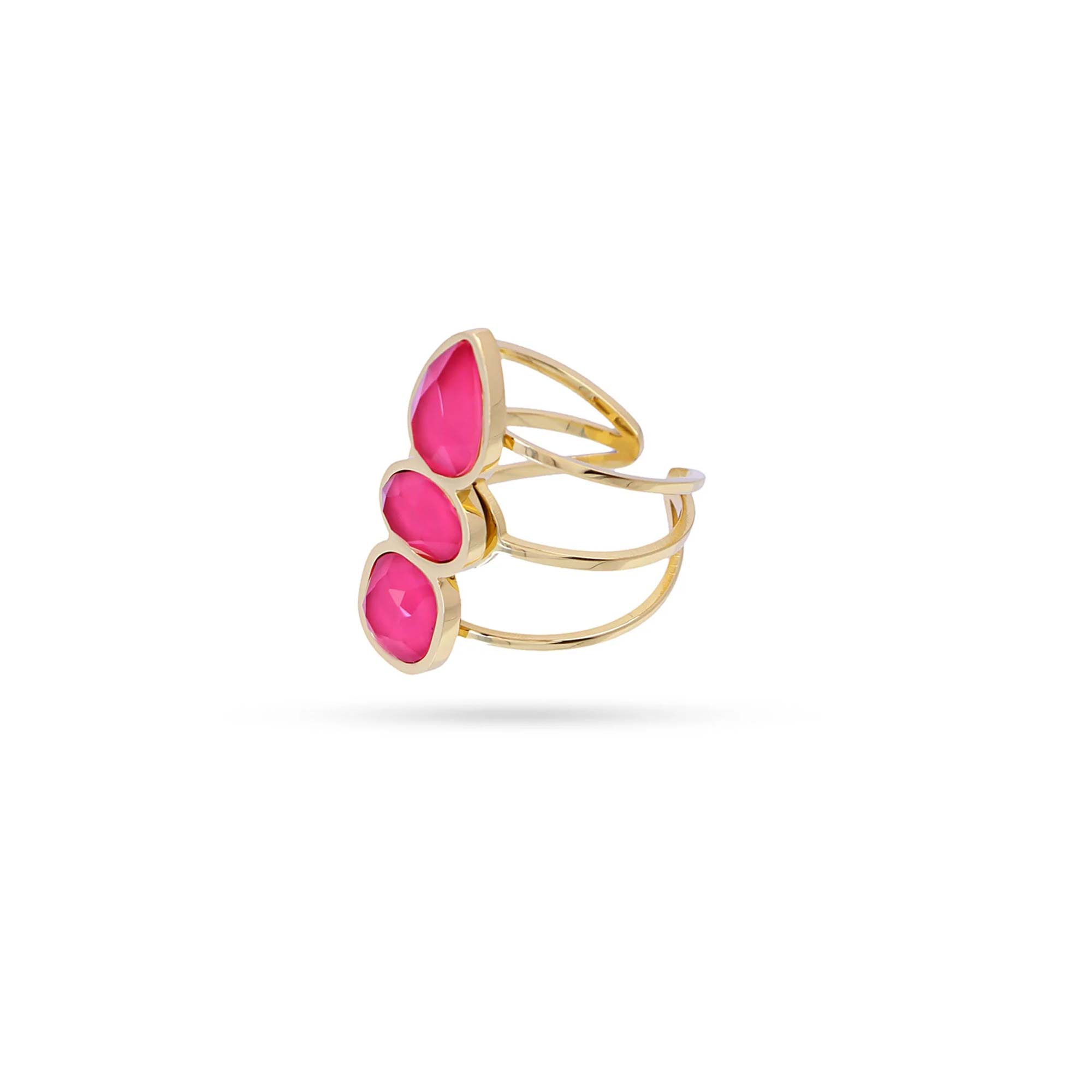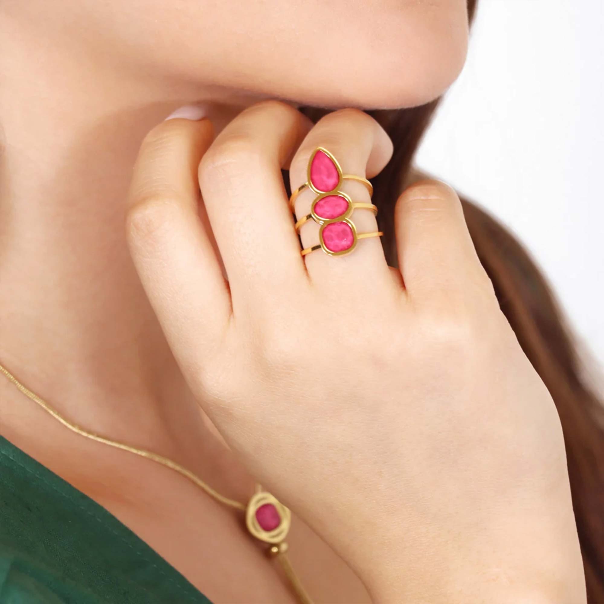 Add to WishlistDistintivo anillo con un diseño moderno de tres piedras naturales engastadas verticalmente sobre una base de bandas entrelazadas. Las piedras presentan diferentes formas: una lágrima en la parte superior, un óvalo en el centro y un cuadrado en la base. Un accesorio audaz y elegante, perfecto para añadir un toque de sofisticación a tu mano.