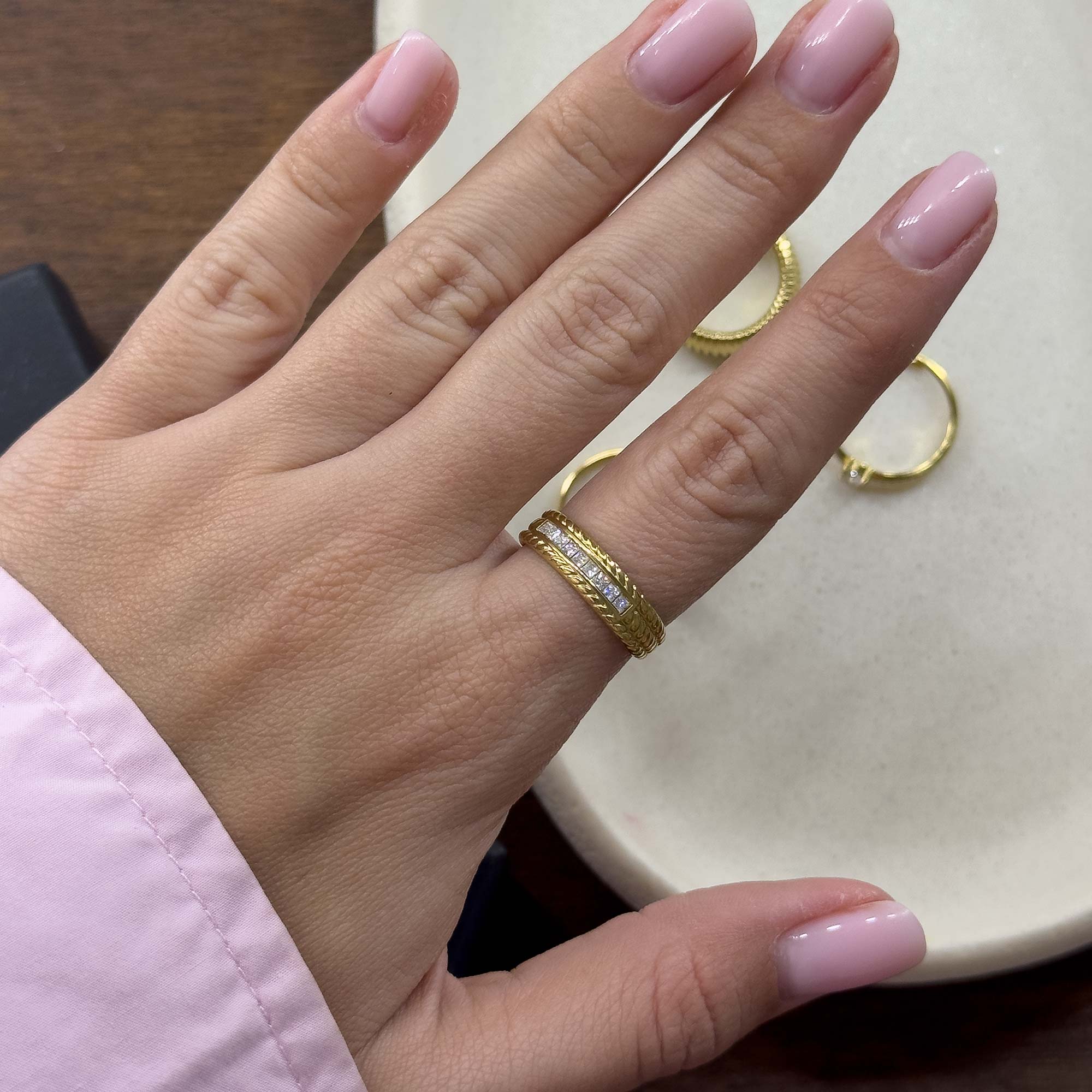 Un diseño que fusiona la inspiración clásica con detalles contemporáneos. Este anillo resalta por su banda labrada con un delicado motivo entrelazado que enmarca una hilera central de circonitas engastadas. Su estructura abierta en la parte posterior garantiza comodidad, mientras que el contraste entre la textura del grabado y el brillo lineal de las piedras crea una pieza armoniosa y llena de detalles refinados.