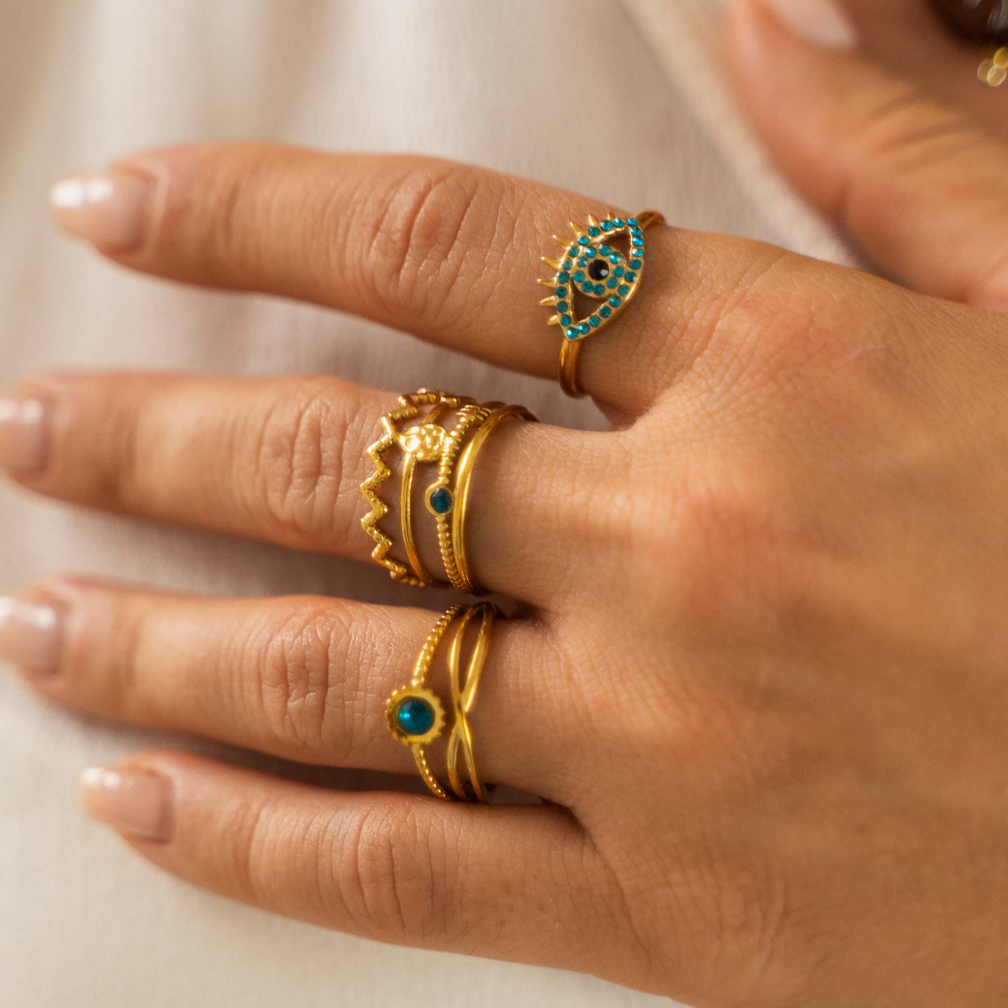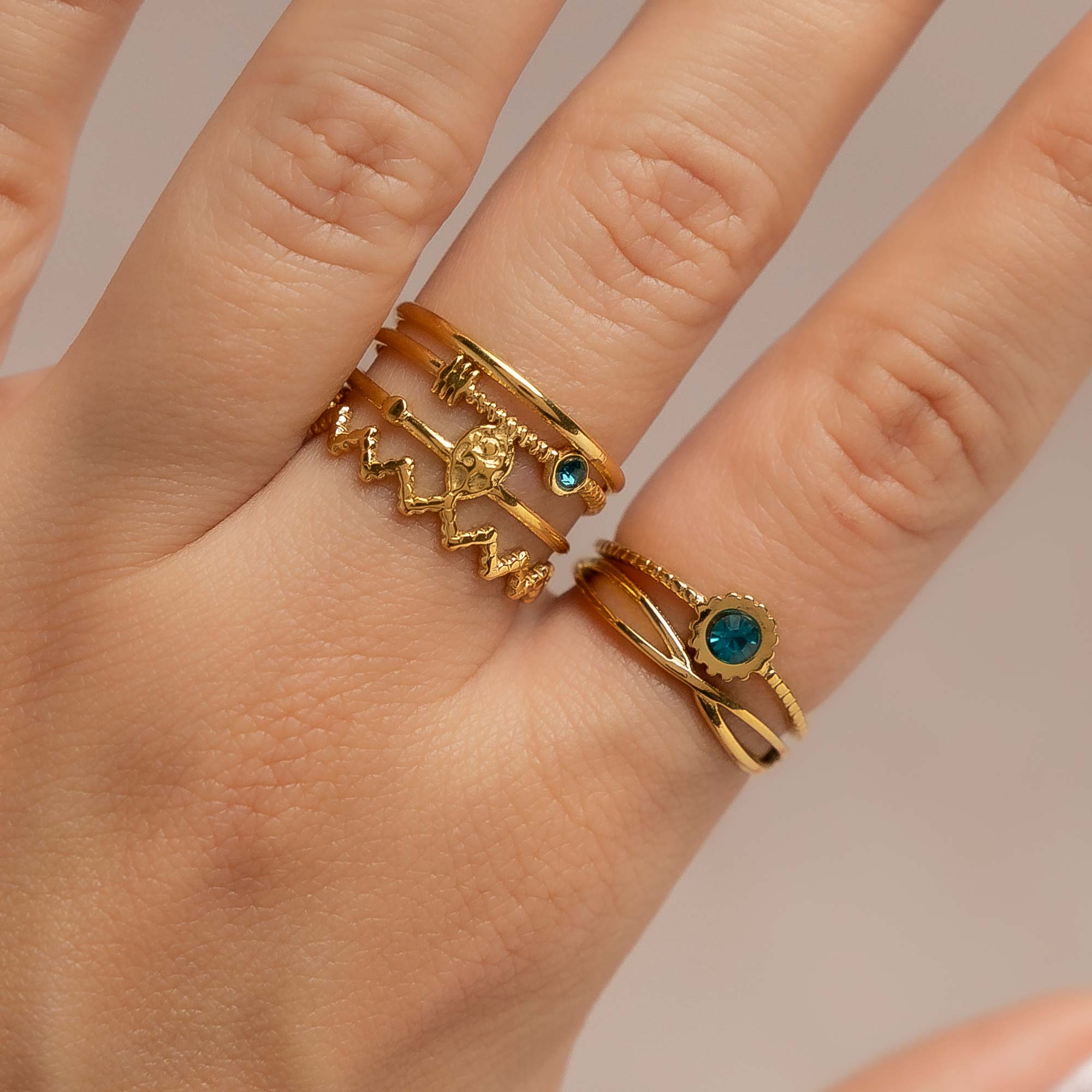 Add to WishlistImpactante anillo de diseño multicapa, compuesto por varias bandas con texturas y adornos variados. Incluye una banda con patrón en zigzag, otra con una figura central grabada y detalles calados, y otra con una pequeña circonita redonda de color verde esmeralda. El diseño se complementa con motivos geométricos y líneas texturizadas. Un accesorio moderno y distintivo, ideal para añadir un toque de originalidad y sofisticación a tu mano.