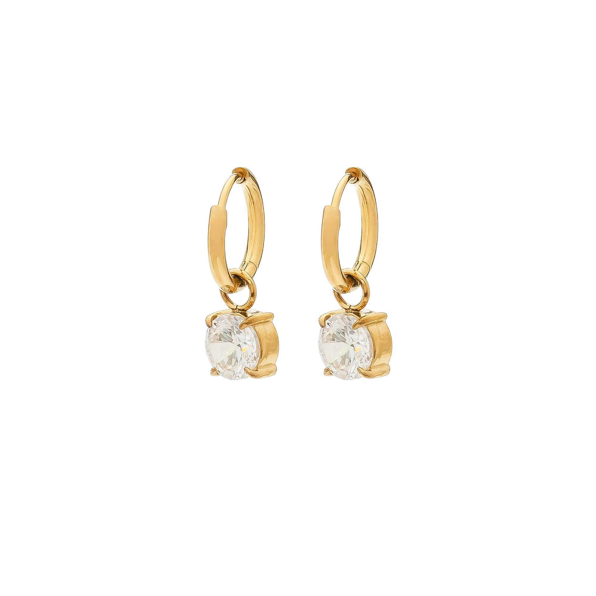 Add to WishlistEstos pendientes presentan un diseño de aro pequeño con acabado dorado del que cuelga una circonita de gran tamaño en talla brillante, aportando luz y elegancia clásica.