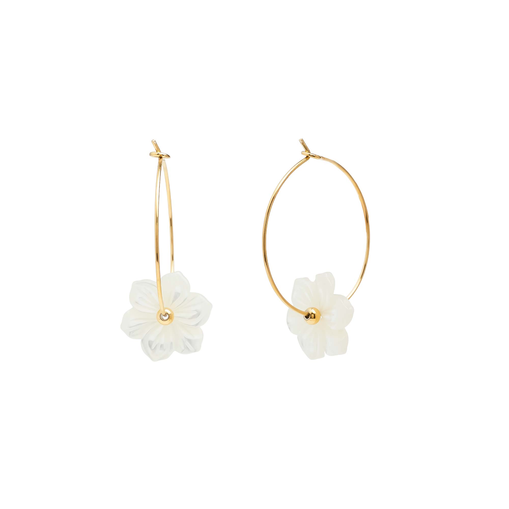 Encantadores pendientes de aro con un diseño delicado. Cada aro, de acabado brillante, lleva colgando una flor tallada de color blanco nacarado en su parte inferior, con un pequeño centro redondo en tono dorado. Son perfectos para añadir un toque de frescura y feminidad a cualquier conjunto.