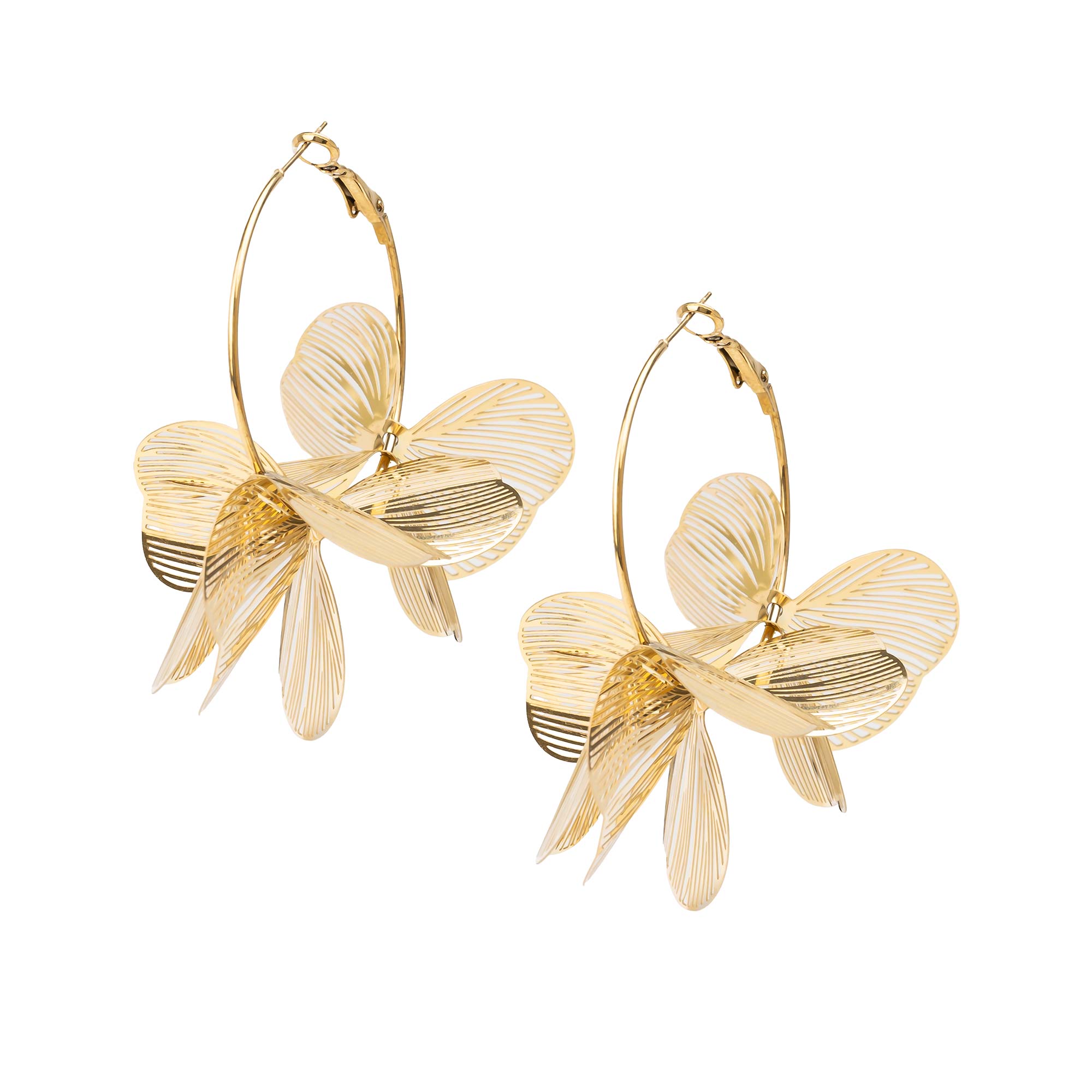 Pendientes con forma aro y una flor colgante. No pesan. Cierre de presión.