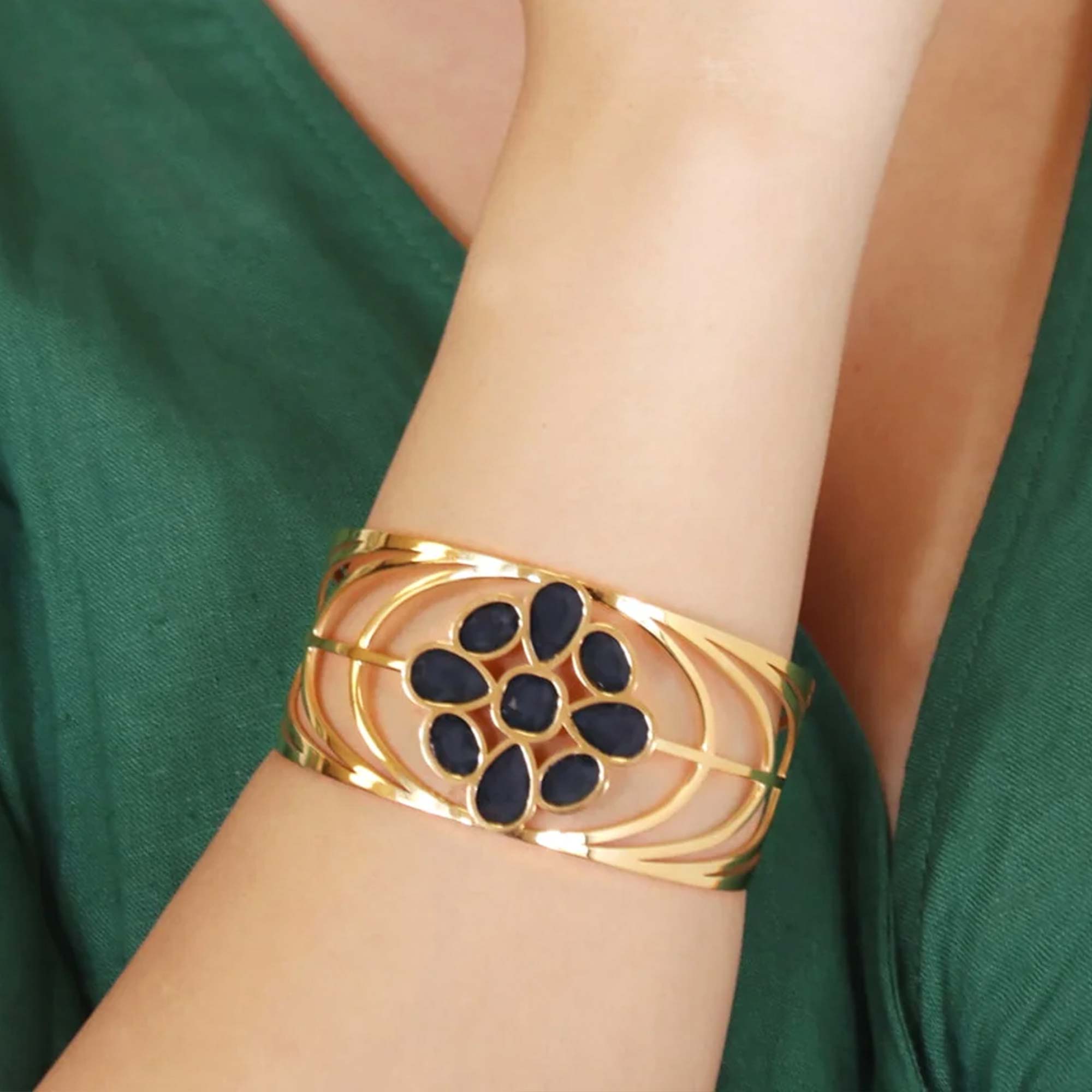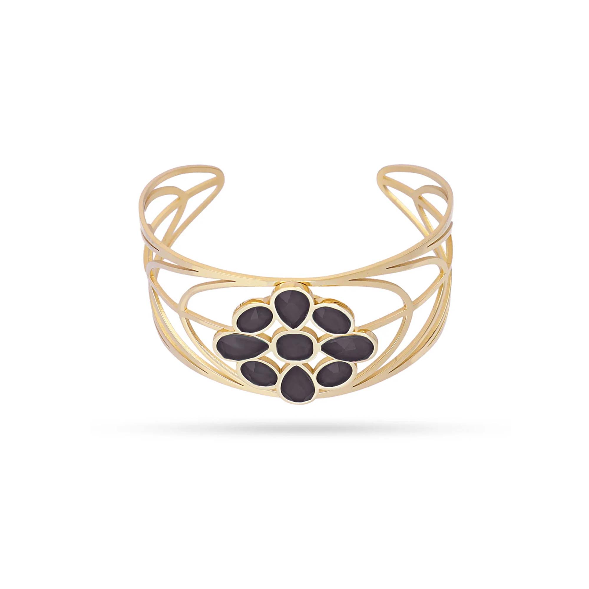 Add to WishlistMagnífico brazalete tipo esclava, con un diseño abierto y una estructura de bandas caladas que se entrelazan elegantemente. En el centro, un deslumbrante adorno floral compuesto por varias piedras naturales en forma de lágrima, dispuestas en un patrón de flor o racimo, que le confieren un toque de elegancia sobria. Un accesorio audaz y sofisticado, perfecto para añadir un toque de distinción y brillo a tu muñeca.
