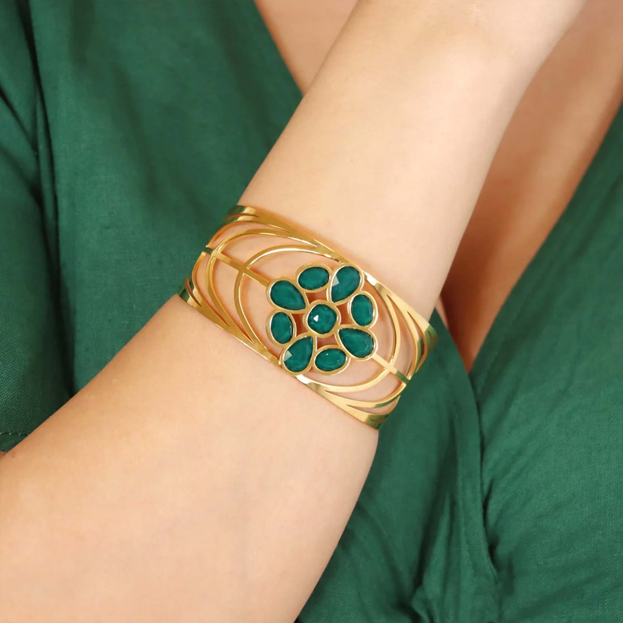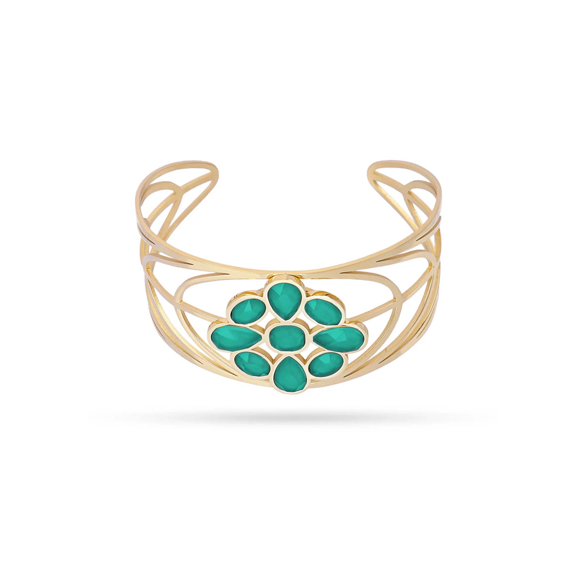 Add to WishlistMagnífico brazalete tipo esclava, con un diseño abierto y una estructura de bandas caladas que se entrelazan elegantemente. En el centro, un deslumbrante adorno floral compuesto por varias piedras naturales de turquesa en forma de lágrima, dispuestas en un patrón de flor o racimo, que le confieren un toque de color vibrante. Un accesorio audaz y sofisticado, perfecto para añadir un toque de elegancia exótica y brillo a tu muñeca.