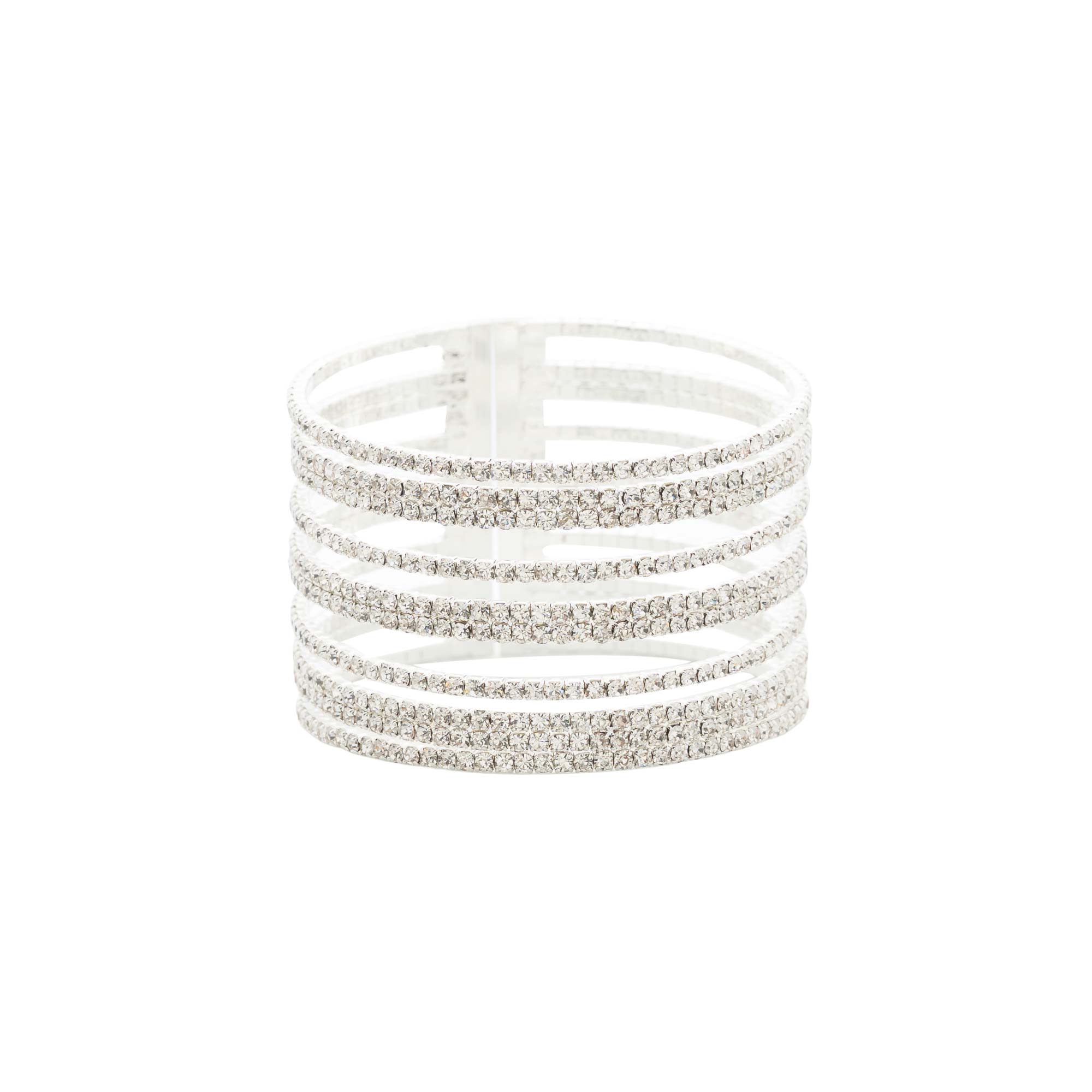 Brazalete ancho para la muñeca, compuesto por múltiples aros flexibles y paralelos que están completamente cubiertos con hileras de pequeñas circonitas.