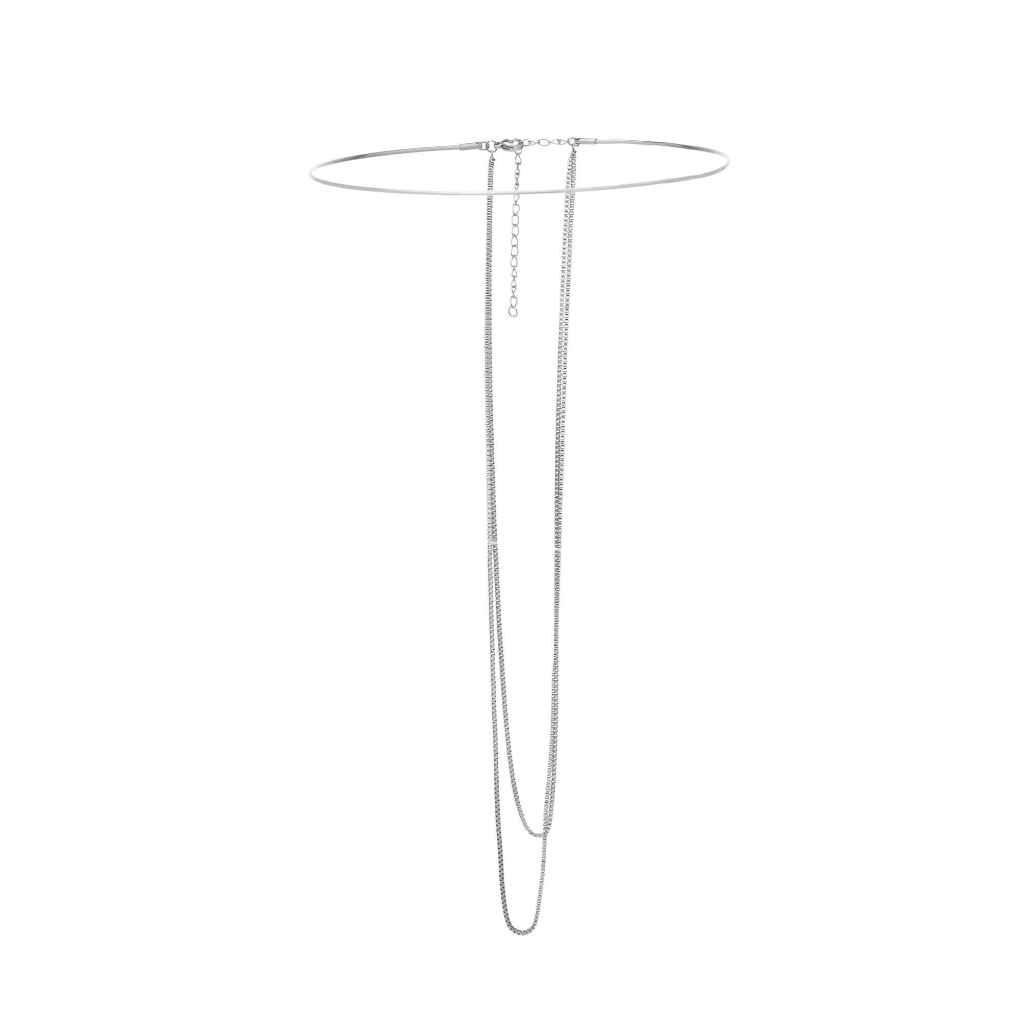 Rompe con lo convencional con este chocker. Su diseño de base rígida se combina con múltiples cadenas de diferentes longitudes que añaden un toque de movimiento y originalidad. Un accesorio perfecto para llevar solo o para combinar con otros collares.