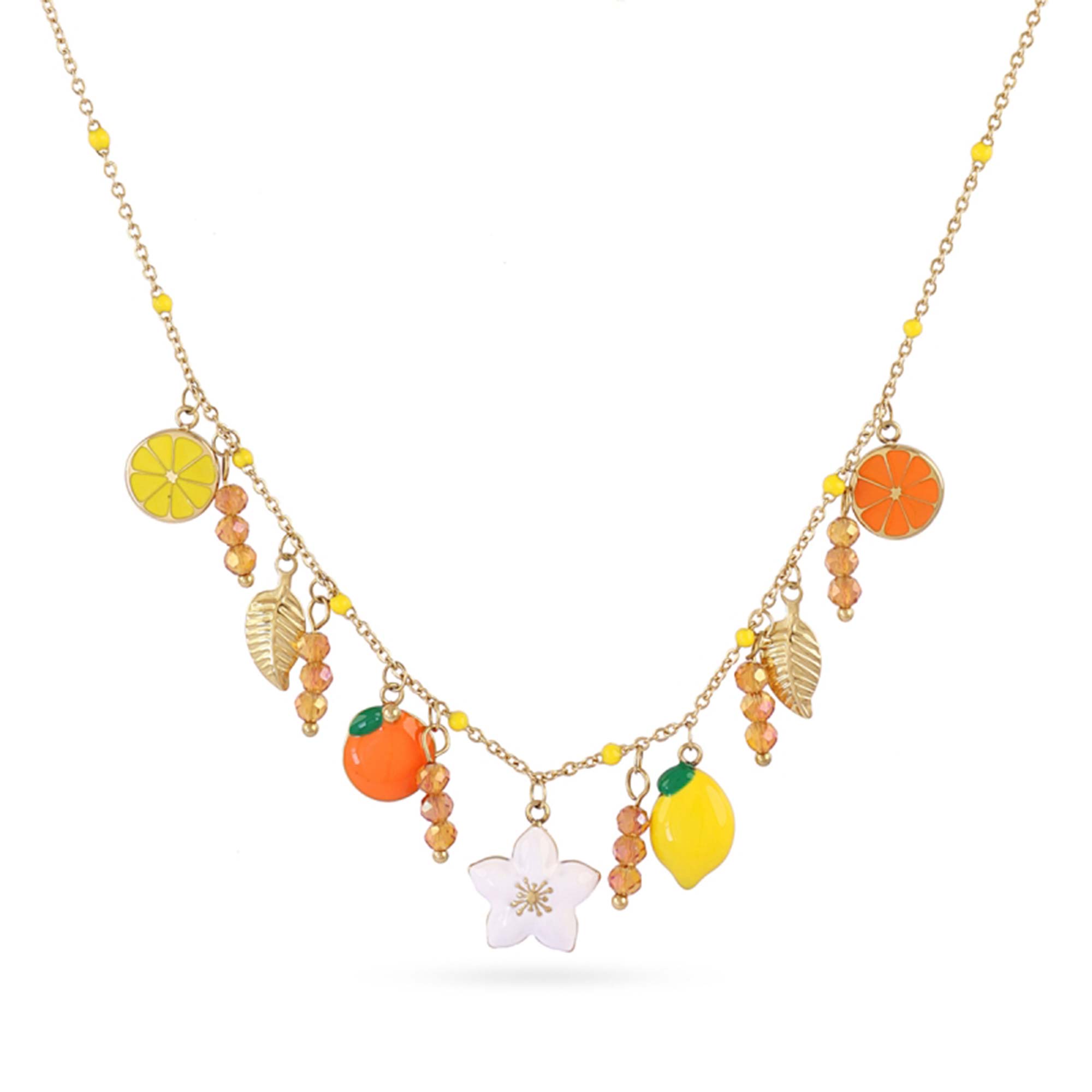 Collar con charms de frutas, hojas y flores que aportan un estilo alegre y veraniego. Colección Anartxy.