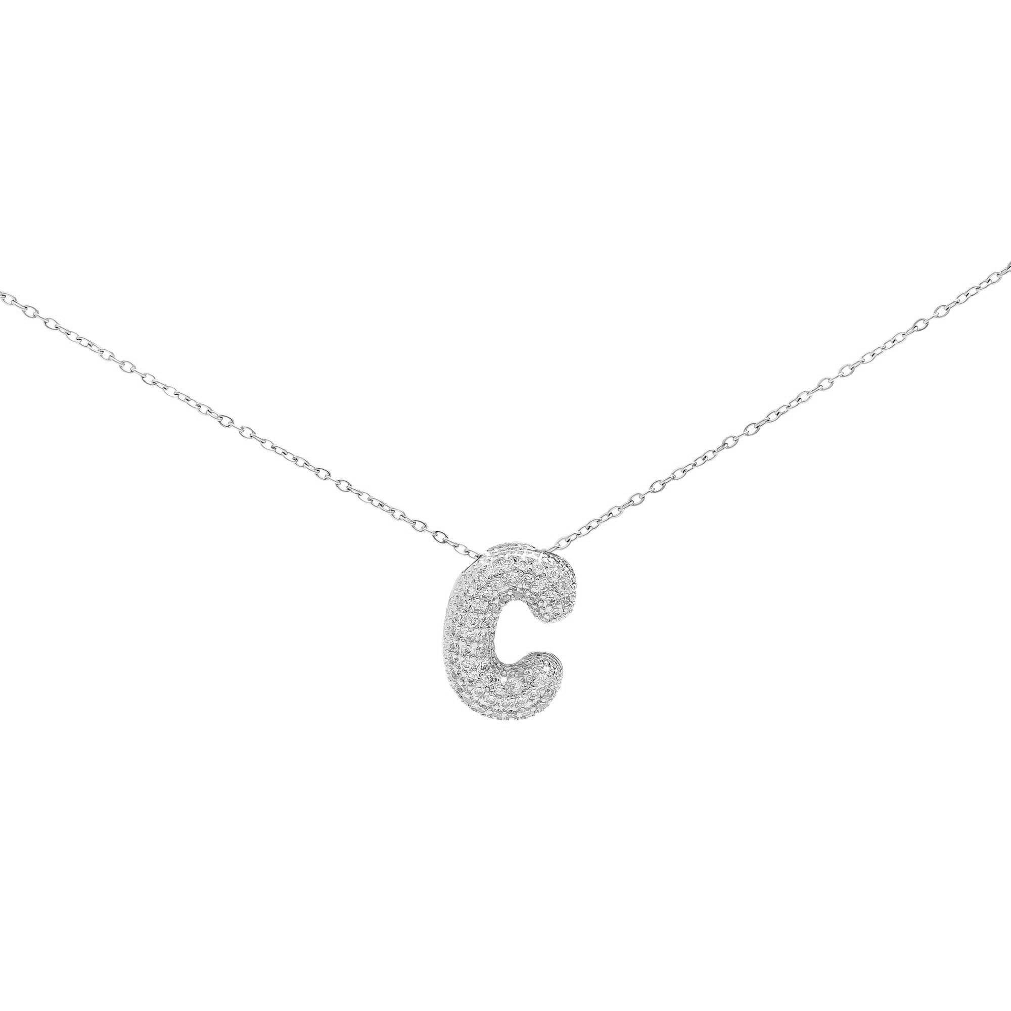 Delicado collar con una cadena fina que sostiene un colgante con la inicial, adornado completamente con pequeños circonitas incrustadas. Esta pieza, personalizable con diferentes iniciales, es un accesorio elegante y significativo, ideal para llevar a diario o para un regalo especial.