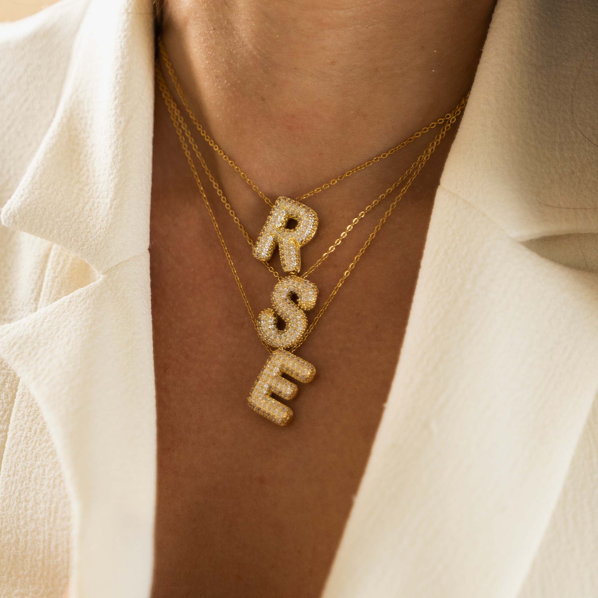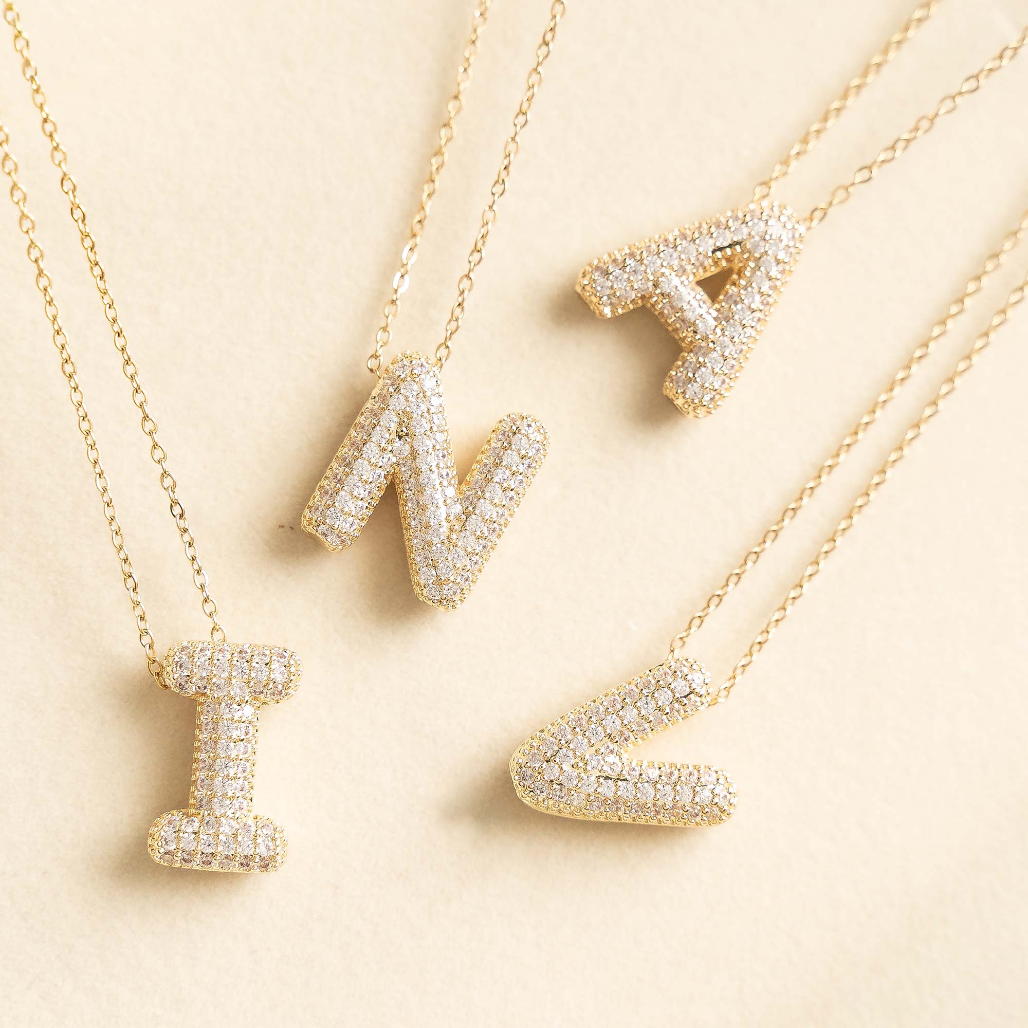 Delicado collar con una cadena fina que sostiene un colgante con la inicial, adornado completamente con pequeños circonitas incrustadas. Esta pieza, personalizable con diferentes iniciales, es un accesorio elegante y significativo, ideal para llevar a diario o para un regalo especial.