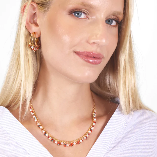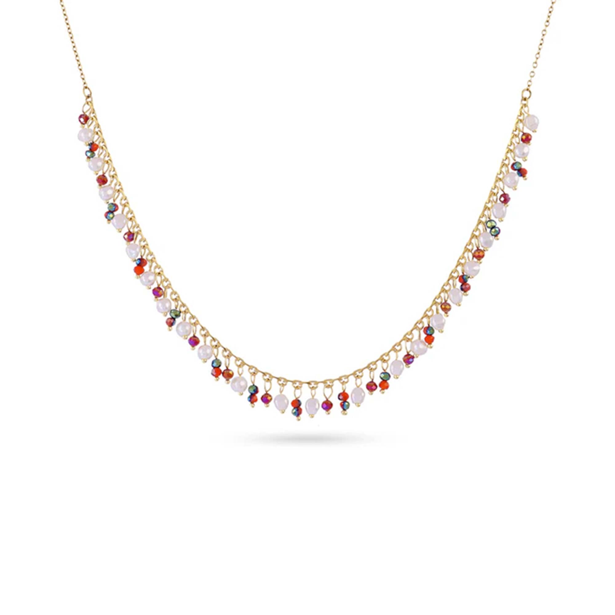 Cada colgante alterna entre pequeñas perlas blancas de agua dulce y cristales facetados en tonos de rojo, granate y azul. La combinación de colores y texturas crea una joya con un aire etéreo y alegre, ideal para añadir un toque de sofisticación a tus looks de día a día. Es perfecto para llevar solo o para crear un look en capas con otros collares. Colección Anartxy.