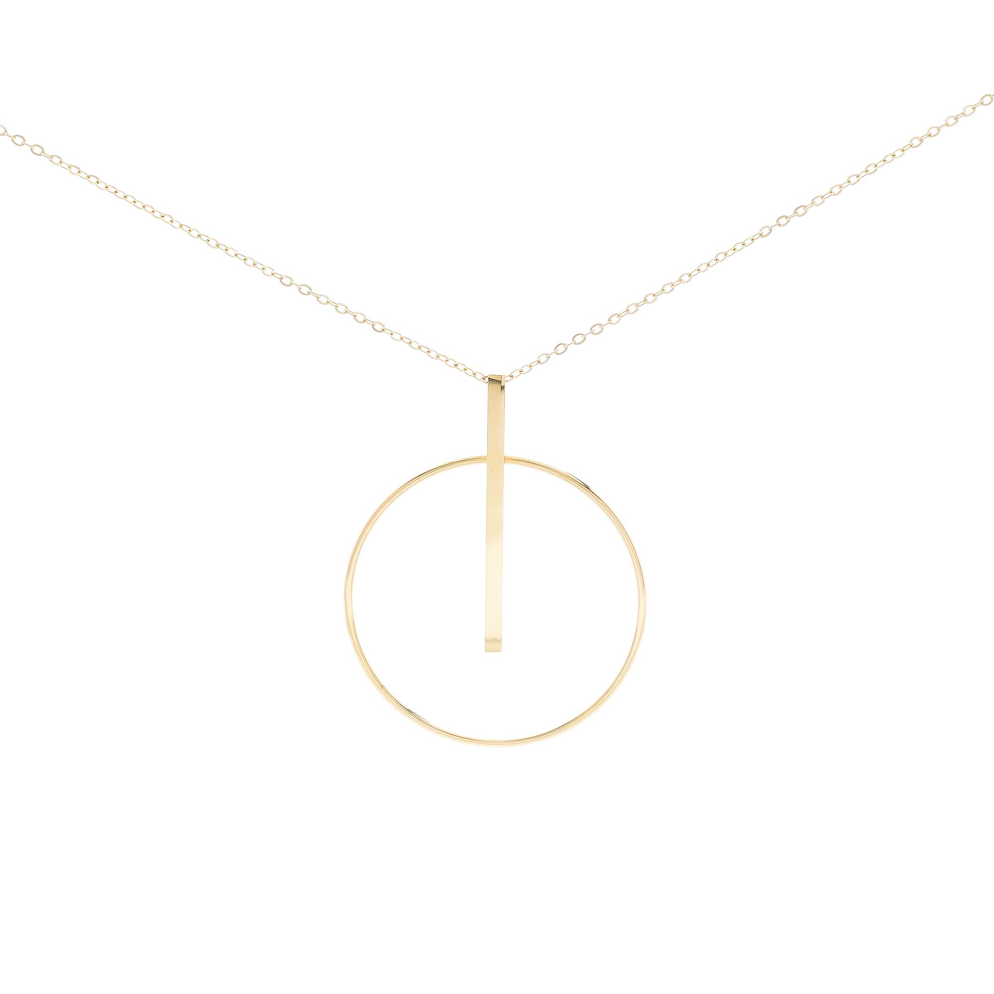 Este es un collar con un diseño geométrico y minimalista. El colgante está compuesto por un aro circular grande que es atravesado por una barra vertical lisa y de acabado lustroso.