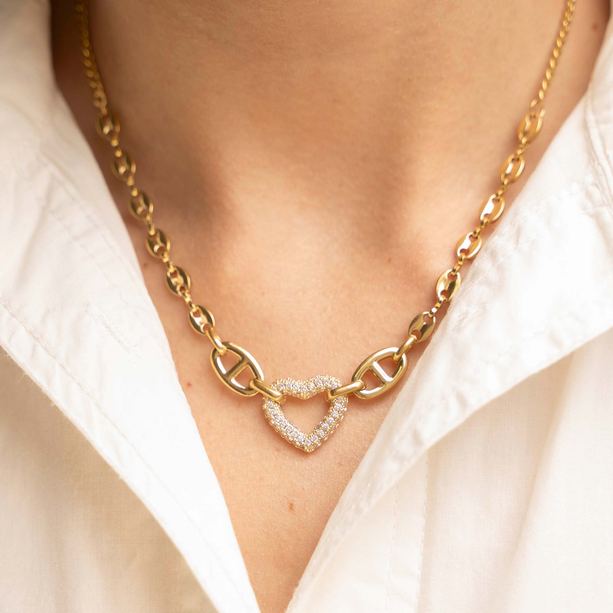 Add to WishlistCollar con eslabones y corazón central repleto de circonitas, llamativo y elegante, perfecto para destacar cualquier look.
