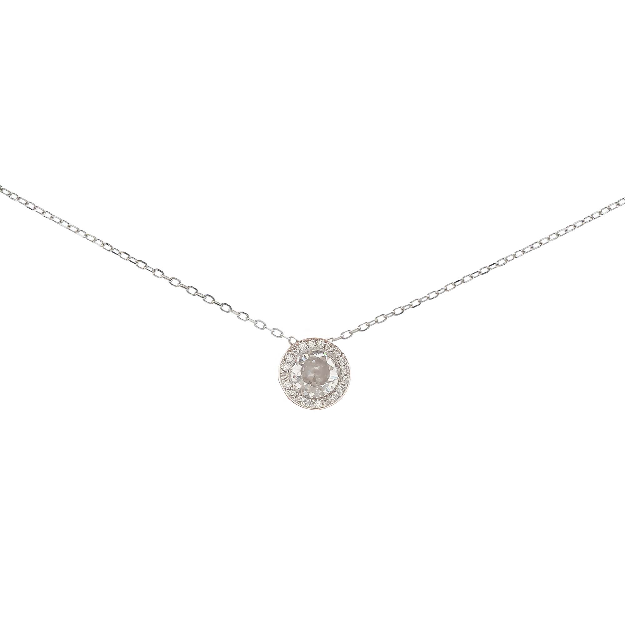 Add to WishlistCollar con una cadena fina y acabado plateado. El colgante central es una gema redonda, rodeada por un halo de pequeñas circonitas.