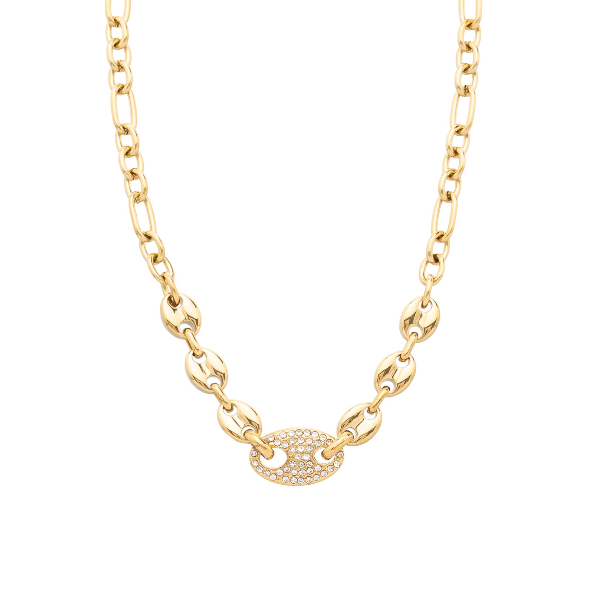 Add to WishlistEste es un collar con un diseño de cadena mixta. La cadena combina eslabones alargados en la parte superior con eslabones más grandes en forma de grano de café en la sección central. El adorno principal es uno de estos eslabones de grano de café, de mayor tamaño y plano, que está completamente cubierto de pequeñas circonitas.