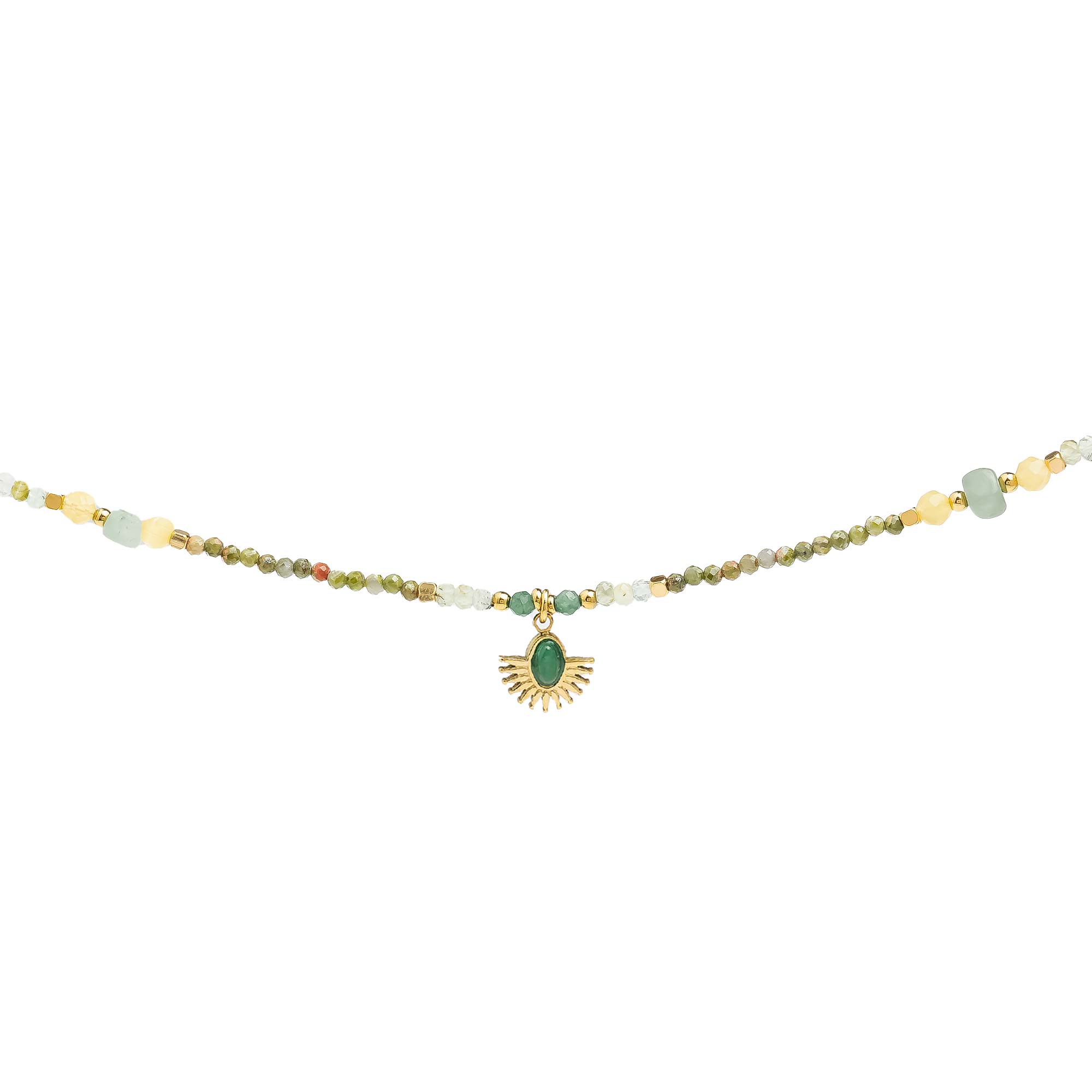 Delicada gargantilla de cuentas finas, compuesta por una mezcla de pequeñas esferas en tonos verdes, amarillos pálidos y blancos, intercaladas con diminutos abalorios cuadrados y redondos brillantes. En el centro, cuelga un colgante con una gema ovalada verde esmeralda, enmarcada por un diseño en forma de rayos de sol. Un accesorio discreto y natural, perfecto para un toque bohemio y luminoso.