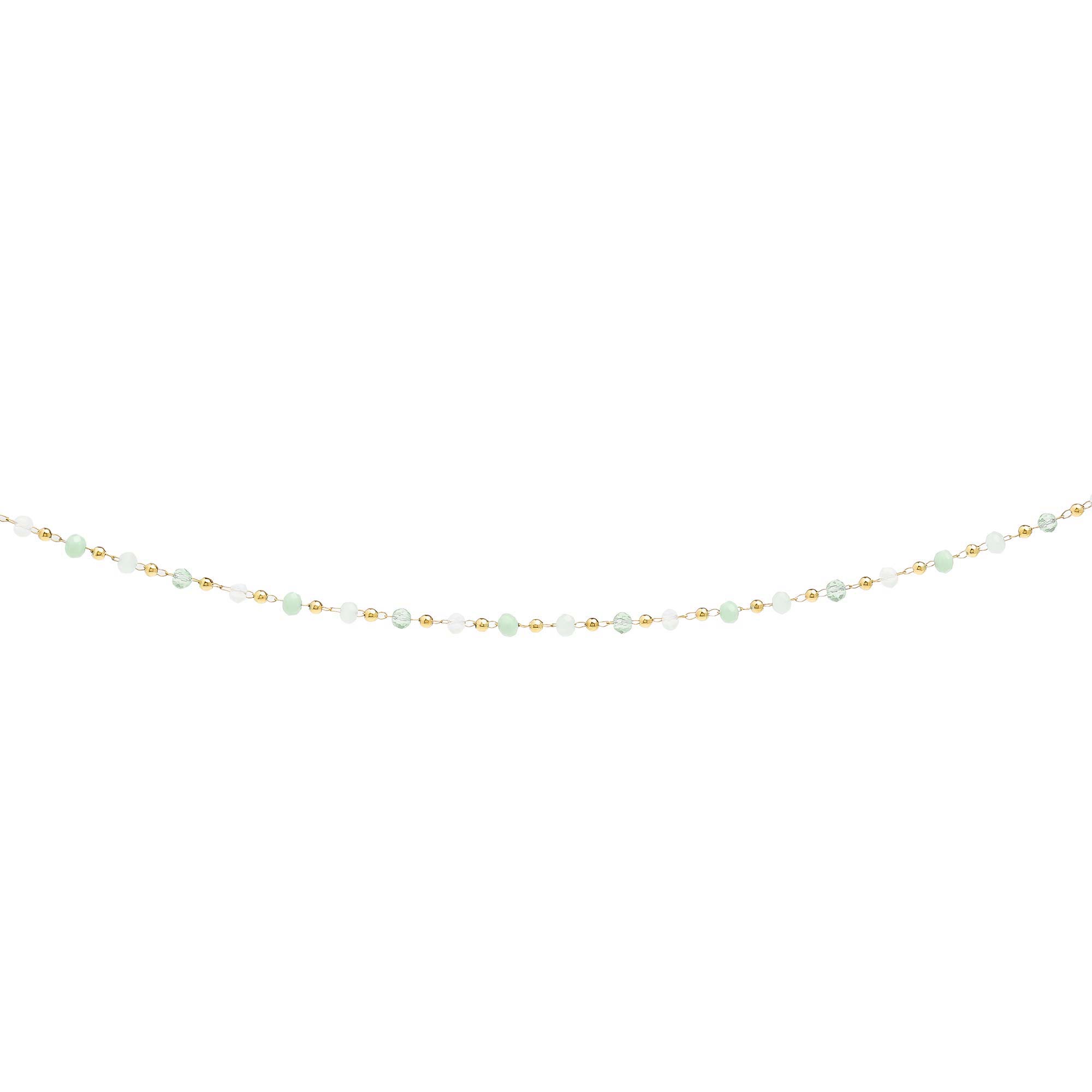 Add to WishlistEste es un collar con una cadena muy fina adornada lo largo de toda su extensión de manera uniforme con pequeñas cuentas redondas. Estas cuentas alternan entre un color verde pálido o menta y un color claro, casi transparente. El diseño es sutil y ligero.