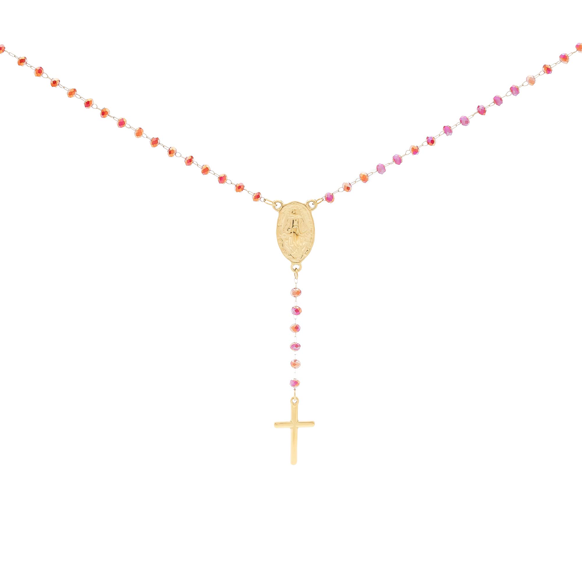 Add to WishlistElegante collar tipo rosario, con una cadena adornada con pequeñas cuentas facetadas de acabado rojo distribuidas a lo largo. En el centro, una medalla ovalada con la imagen de la Virgen Milagrosa sirve de nexo, de la que cuelga una sección adicional de cadena con cuentas y una cruz lisa en el extremo. Un accesorio significativo y sofisticado, perfecto para llevar a diario.