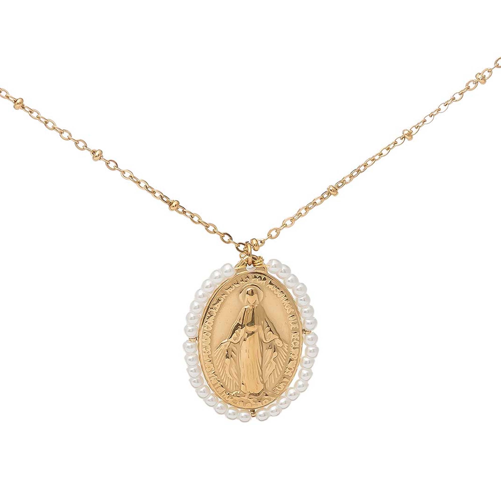 Collar compuesto por cadena con bolitas y medalla ovalada de la Virgen Milagrosa, rodeada de perlas blancas.
