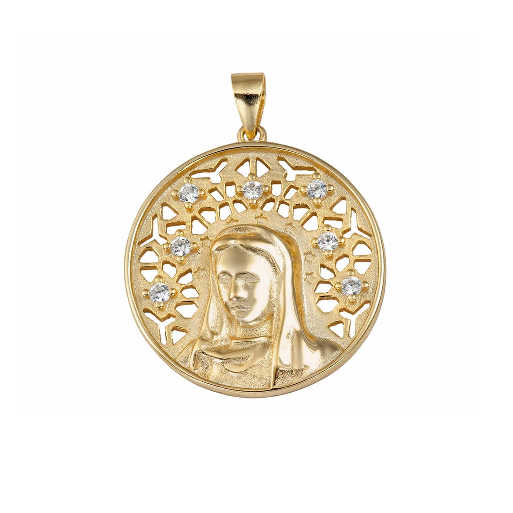 Colgante charm en forma de Virgen Maria con flores y circonitas blancas.