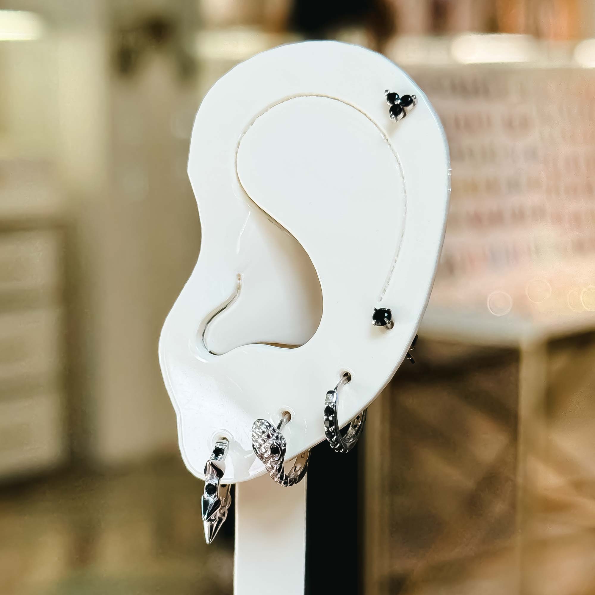 Mini aro en forma de serpiente en plata, con dos piedras de ónix negro como ojos. Cierre fácil de clip.