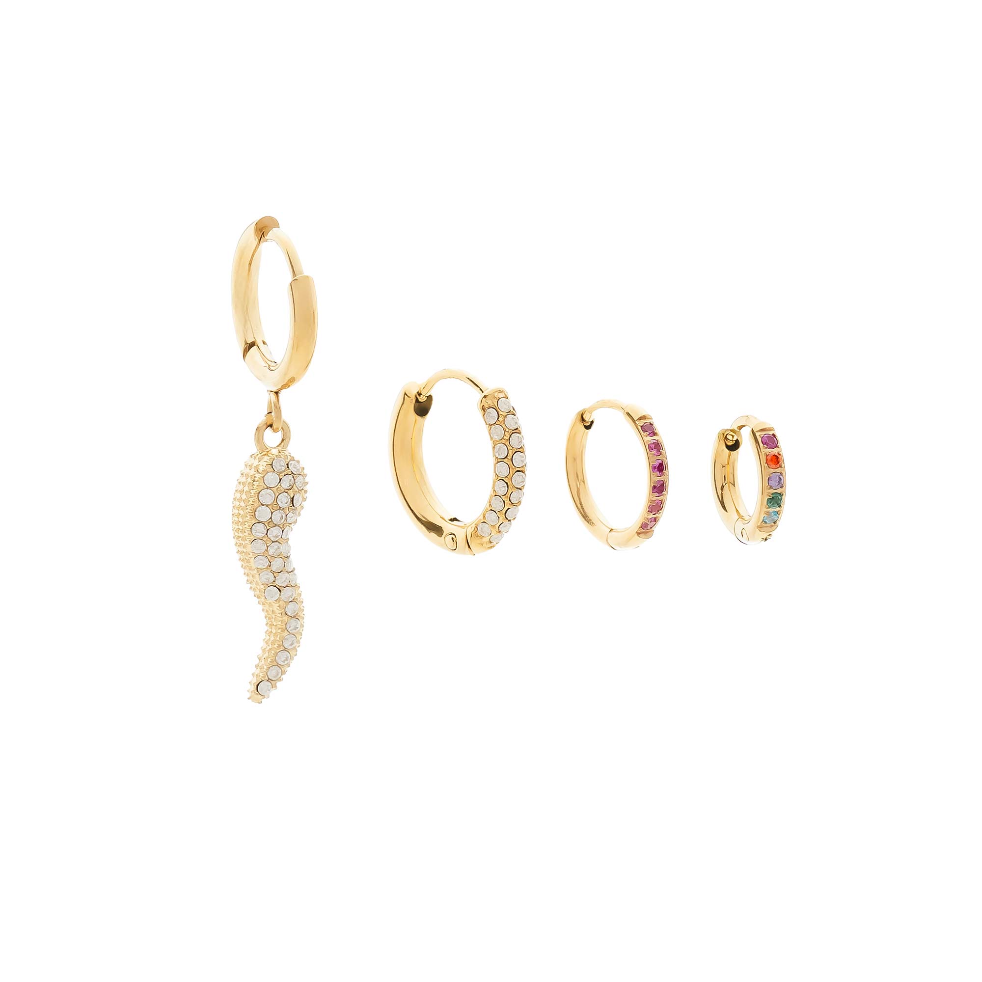 Add to WishlistEl set destaca por un aro del cual suspende un colgante del amuleto «cornicello» totalmente recubierto de pequeñas circonitas que capturan la luz intensamente. Acompañan a esta pieza principal tres aros adicionales de tamaños graduados, cada uno embellecido con circonitas que complementan la estética sofisticada del conjunto. Es la opción perfecta para quienes buscan una composición versátil y moderna que resalte con personalidad y un toque de glamour.