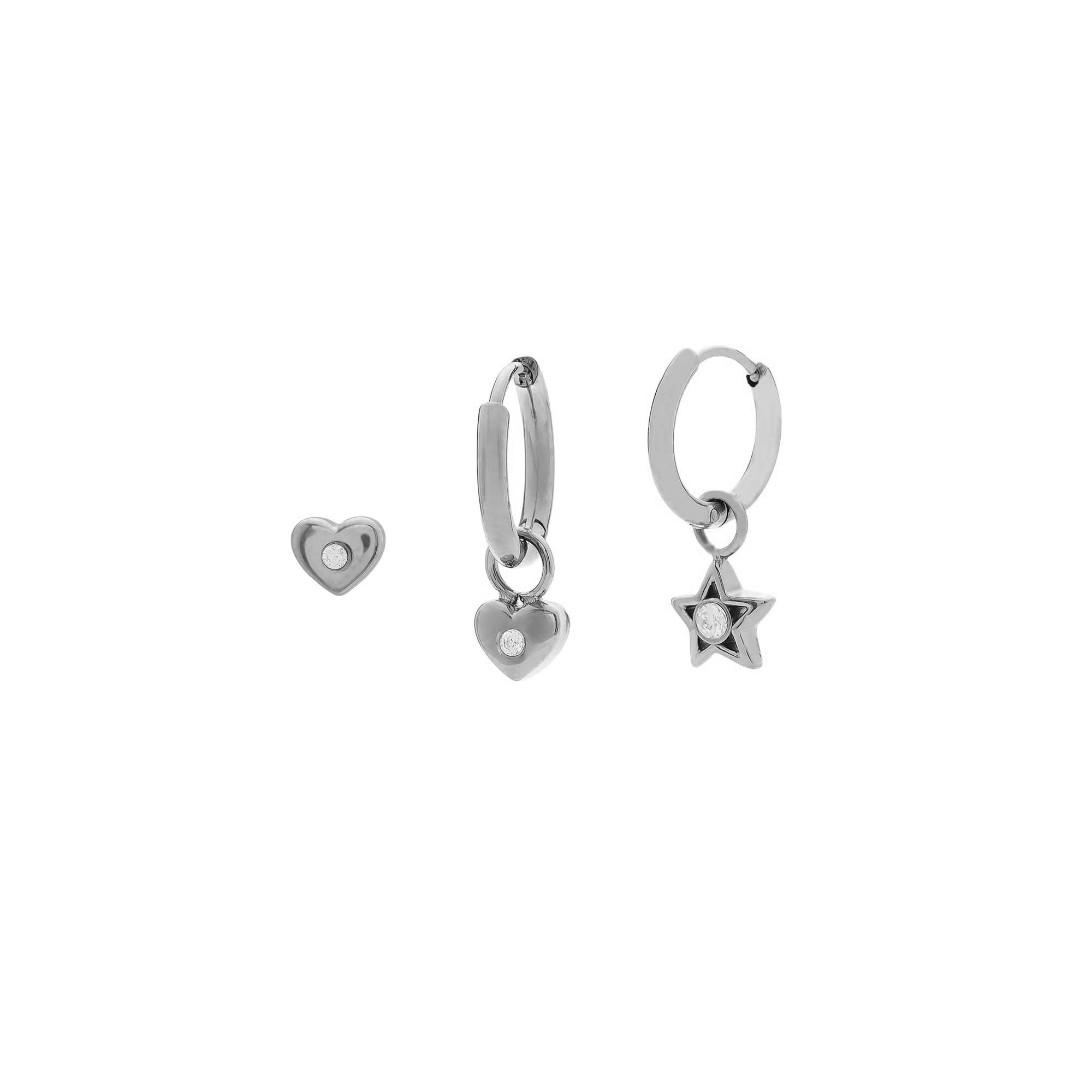 Add to WishlistSet compuesto por un solitario de corazón, una argolla con corazón colgante y una argolla con estrella, todos detallados con circonitas centrales.