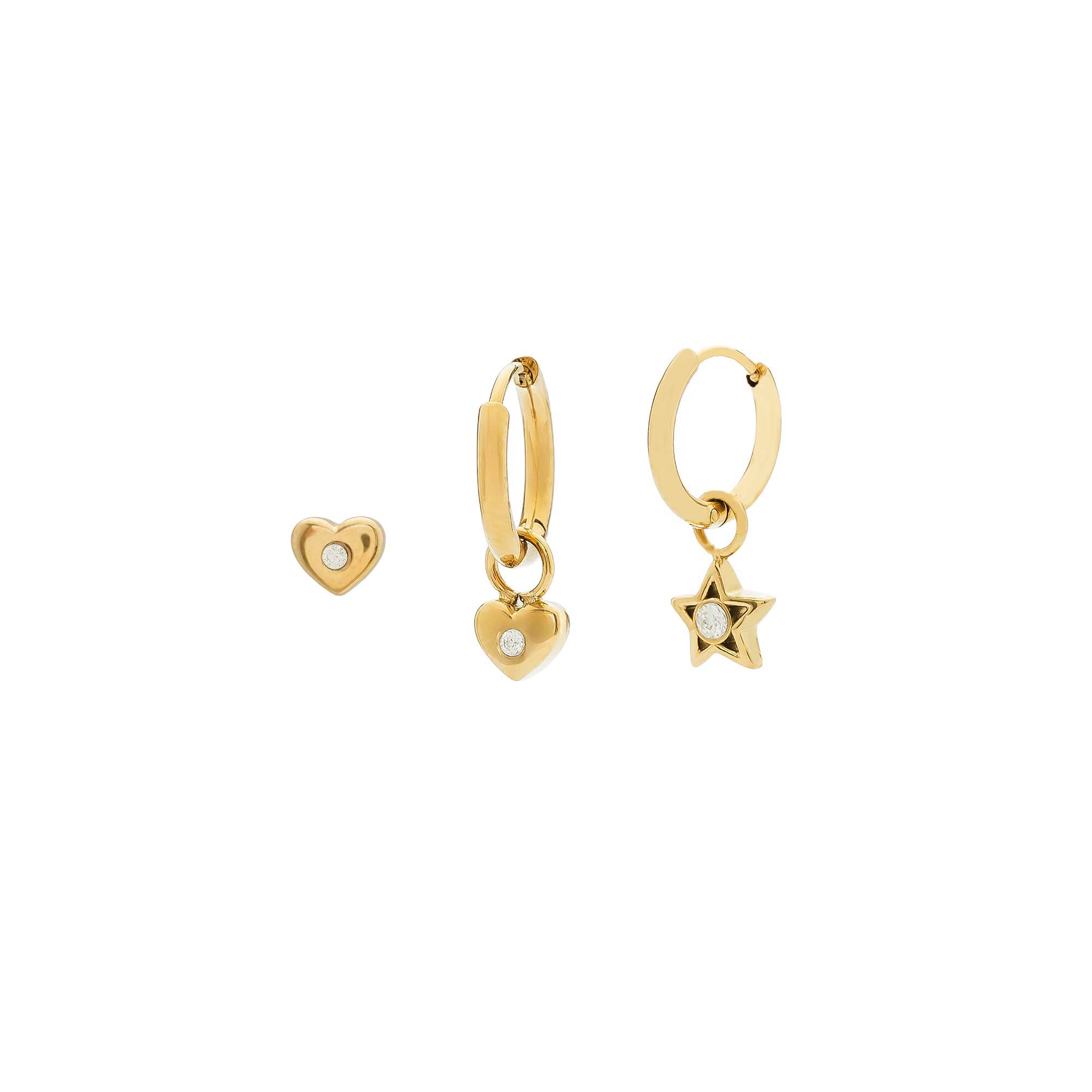 Add to WishlistSet compuesto por un solitario de corazón, una argolla con corazón colgante y una argolla con estrella, todos detallados con circonitas centrales.