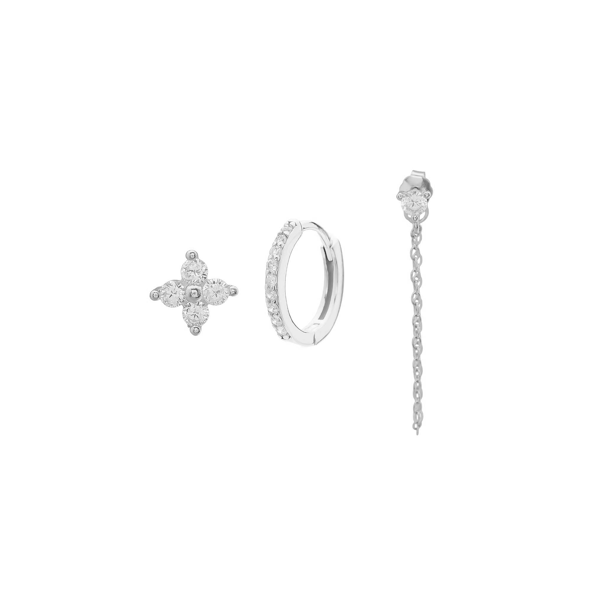 Set de tres pendientes independientes que incluye un pendiente en forma de flor con circonitas, un aro pequeño con circonitas y una circonita con cadena colgante.