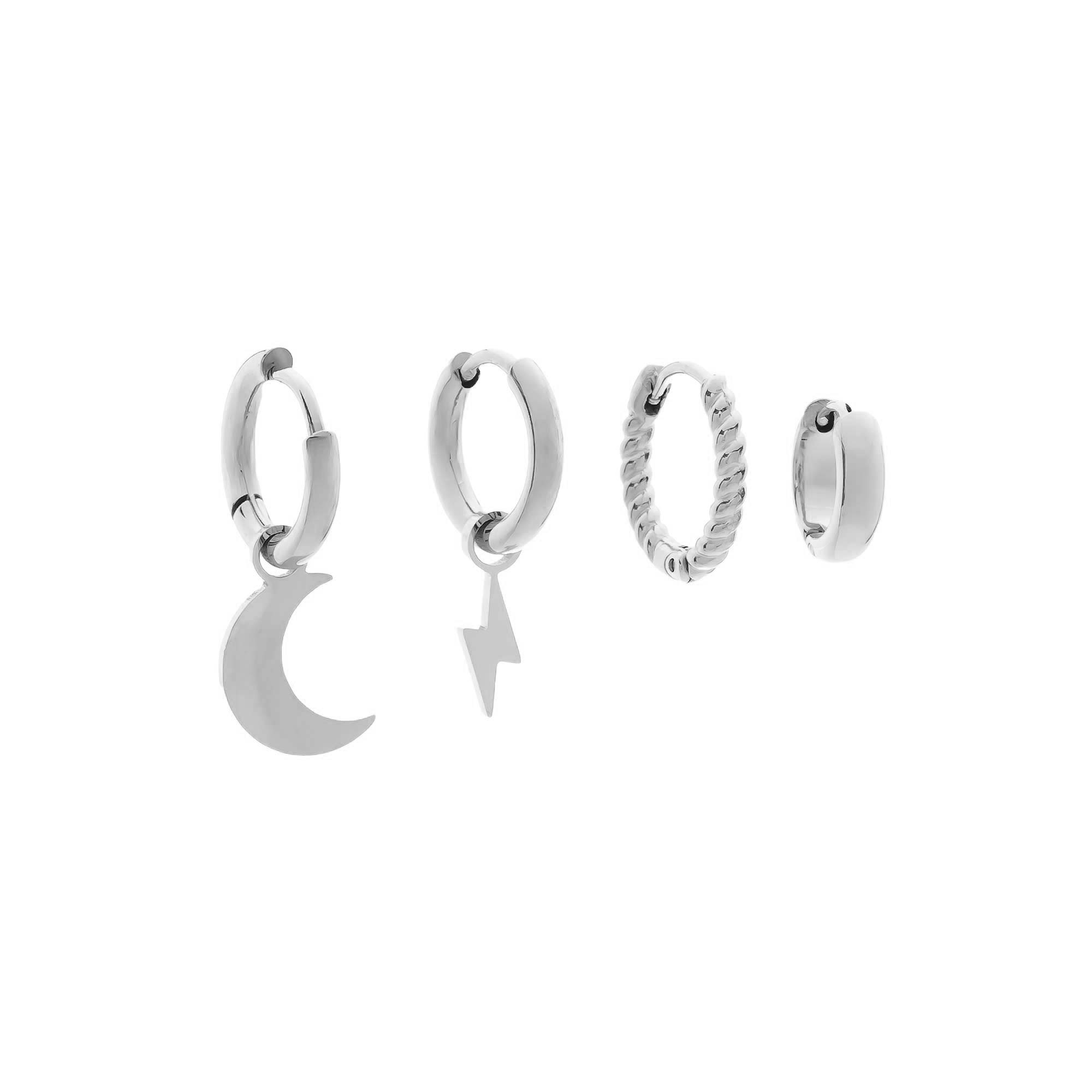 Add to WishlistEste set de pendientes reúne: un aro con un colgante en forma de luna creciente, otro con un rayo, un aro con un sofisticado diseño trenzado y un cuarto aro liso.