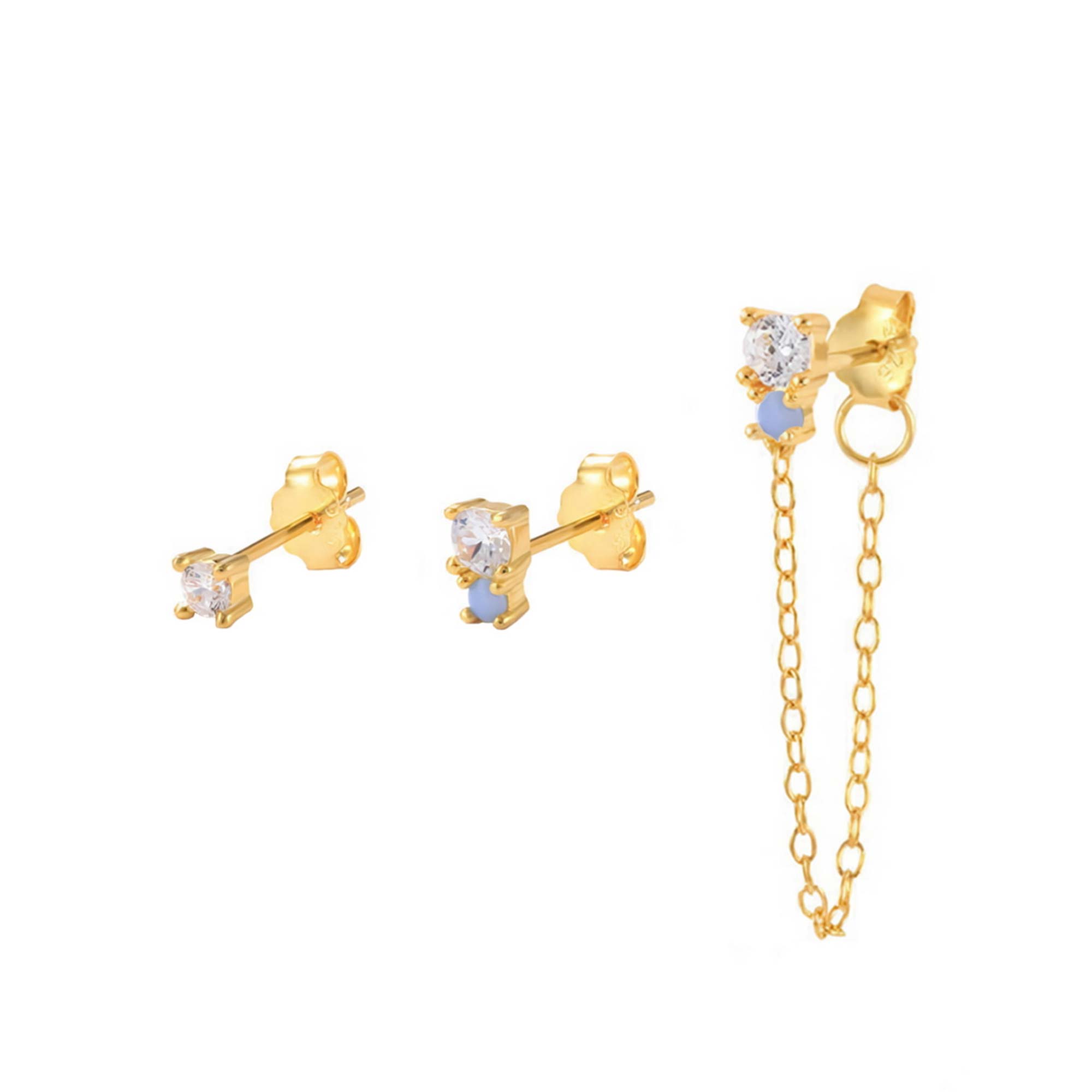 Crea tu propio estilo con este versátil pack de pendientes. Combina unos aros minimalistas con circonitas brillantes con un pendiente de cadena que añade un toque de movimiento y color a tu look.