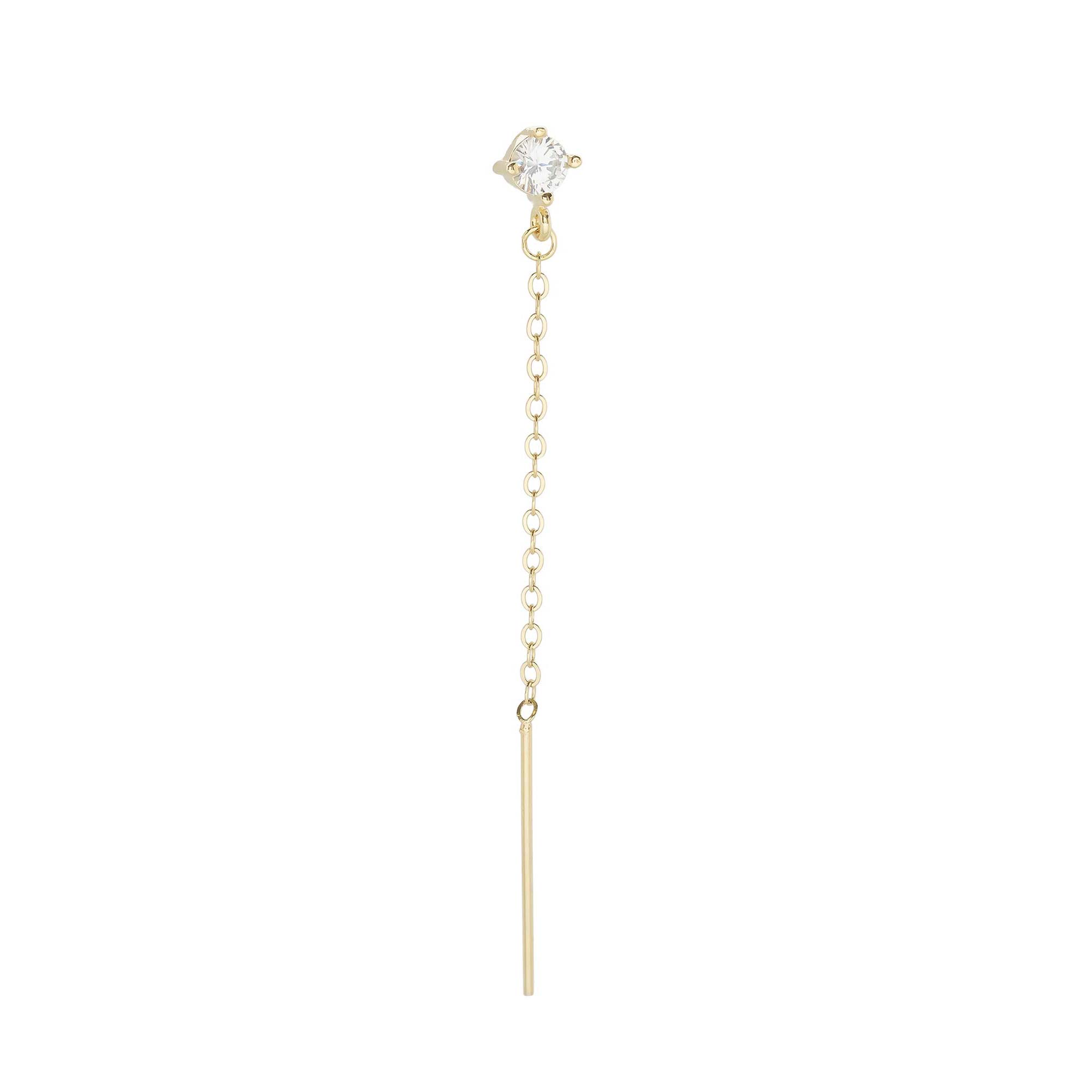 Add to WishlistPendientes largos y colgantes con acabado dorado. La parte superior es una circonita redonda y transparente engastada. De ella cuelga una cadena fina que termina en una barra o línea recta y lisa. El diseño es simple y lineal, proporcionando un movimiento fluido.