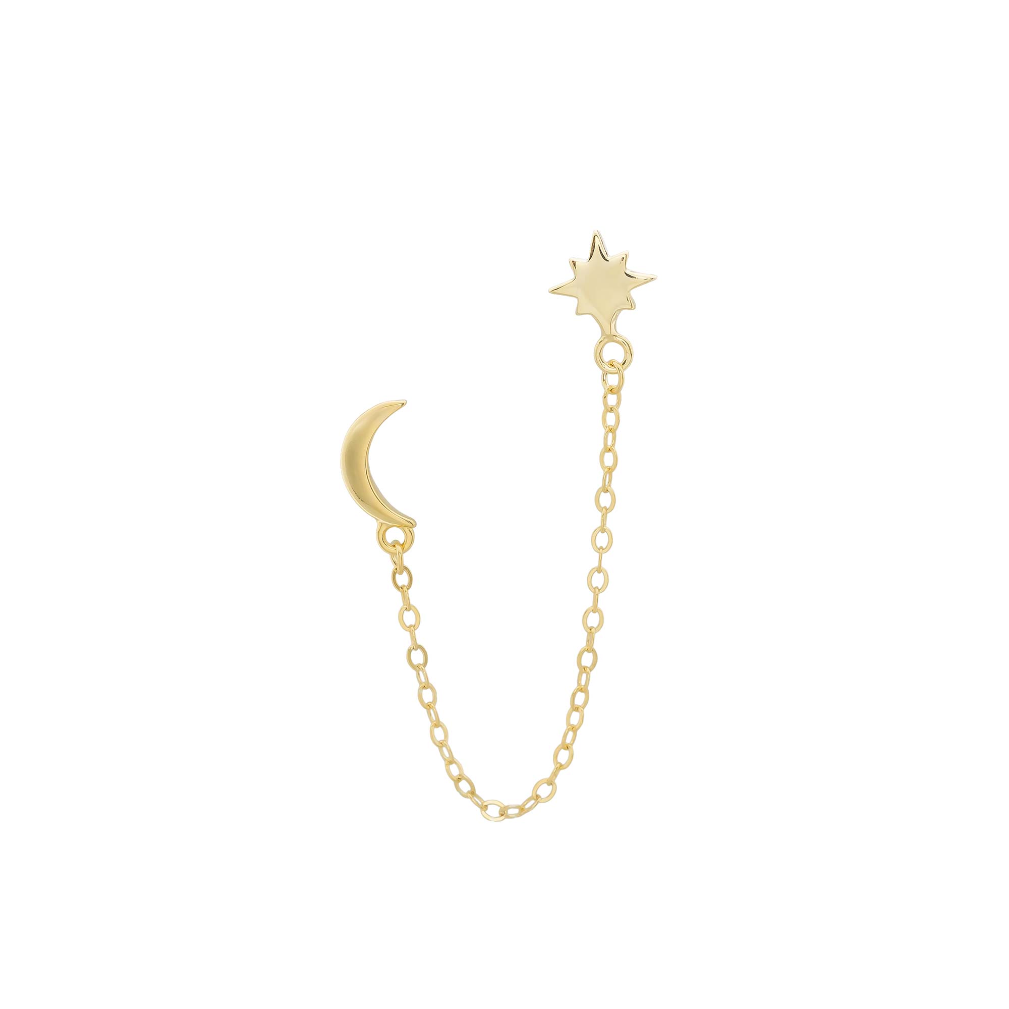 Add to WishlistPendiente diseñado para conectar dos perforaciones. El adorno consiste en una figura de media luna lisa y una figura de estrella con picos irregulares. Ambos elementos están unidos por una cadena de eslabones simples que cuelga en forma de ‘U’.