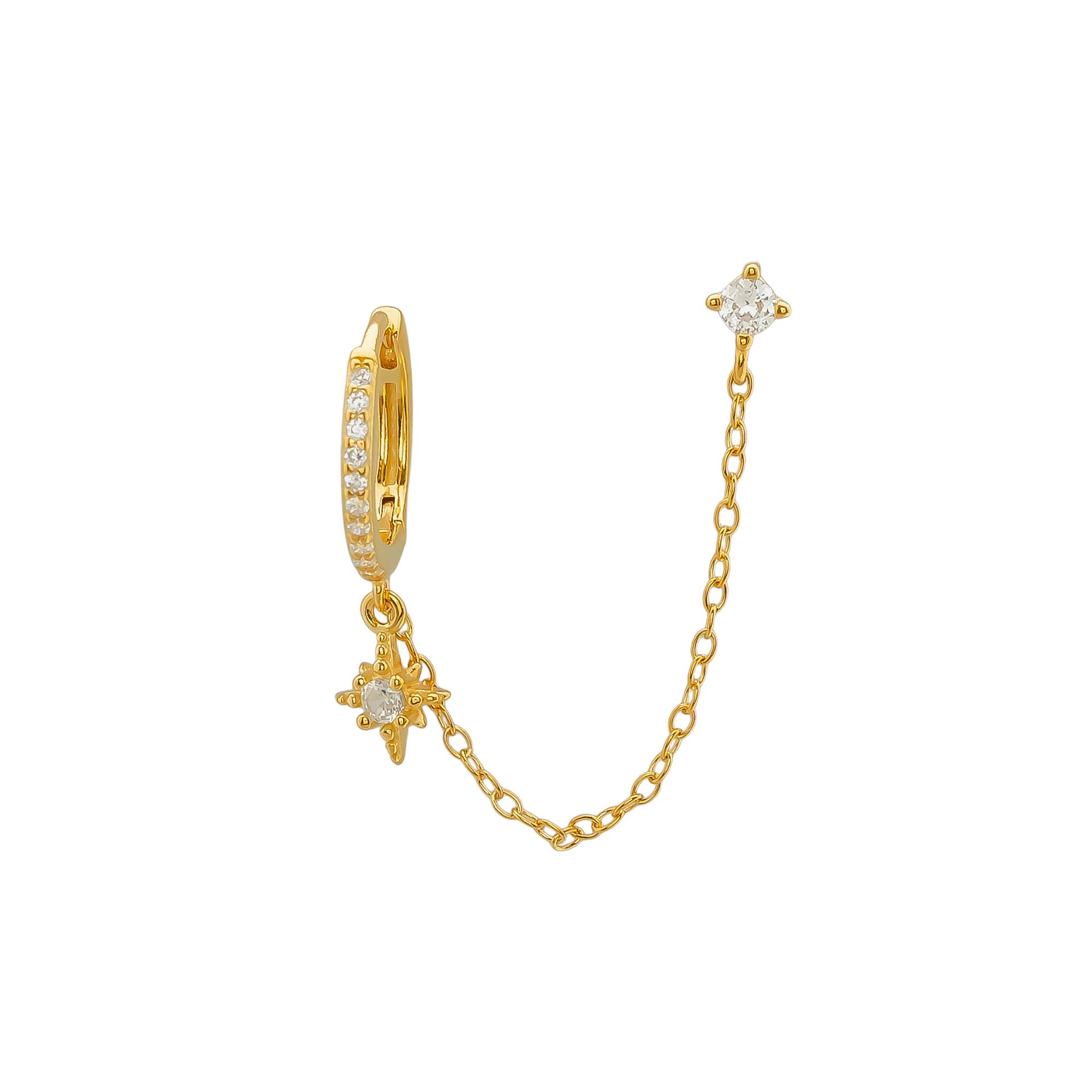 Add to WishlistEste pendiente doble combina un pequeño aro completamente adornado con circonitas del que cuelga una estrella polar unido a una circonita brillante por una delicada cadena colgante.