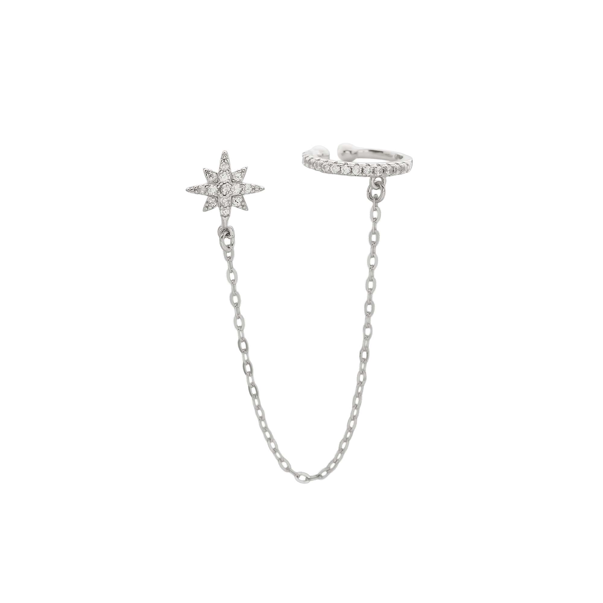 Pendiente compuesto por un diseño de estrella adornado con circonitas pequeñas y un broche de presión, ambos elementos unidos por una cadena. El acabado del metal es plateado.