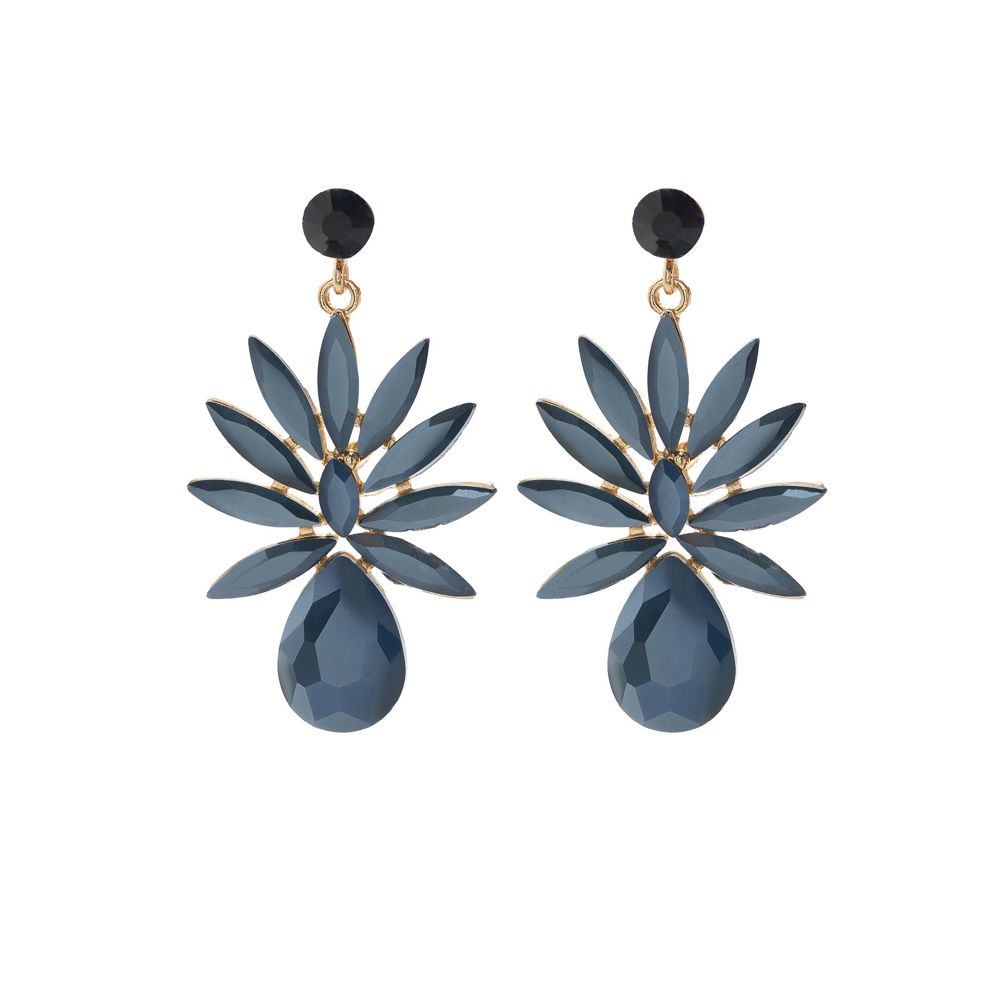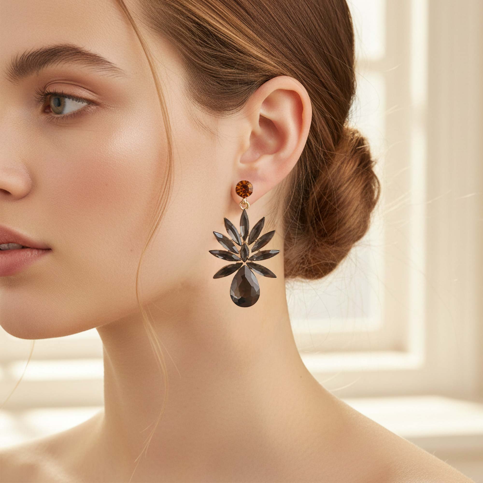 Add to WishlistPendientes de diseño maximalista con una composición radial de piedras en forma de gota y marquesa. La pieza presenta una piedra circular en la base de la que pende un motivo floral geométrico y una gran lágrima central facetada.