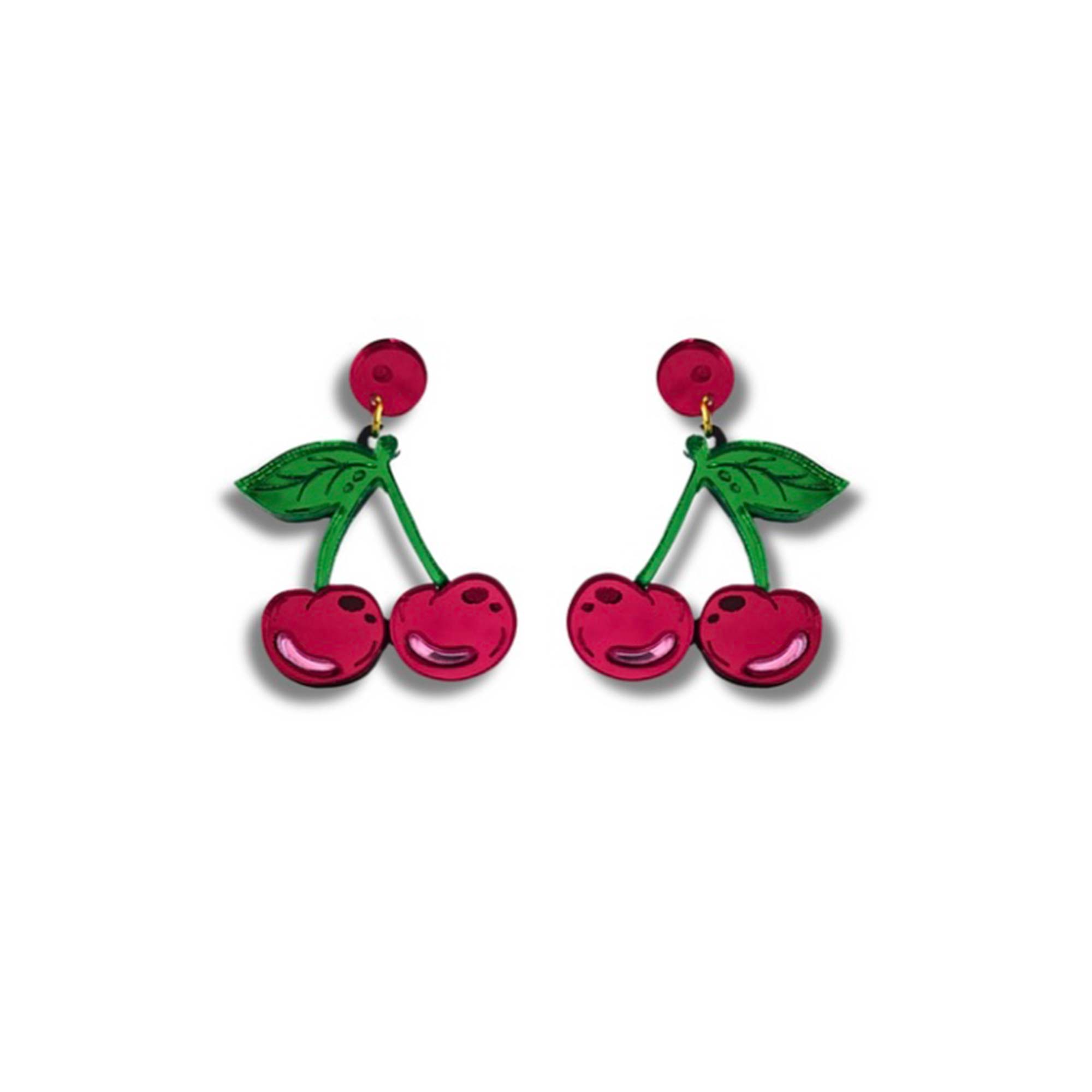 Pendientes de metacrilato con forma de cerezas. Efecto shiny/espejo. Cierre de presión.