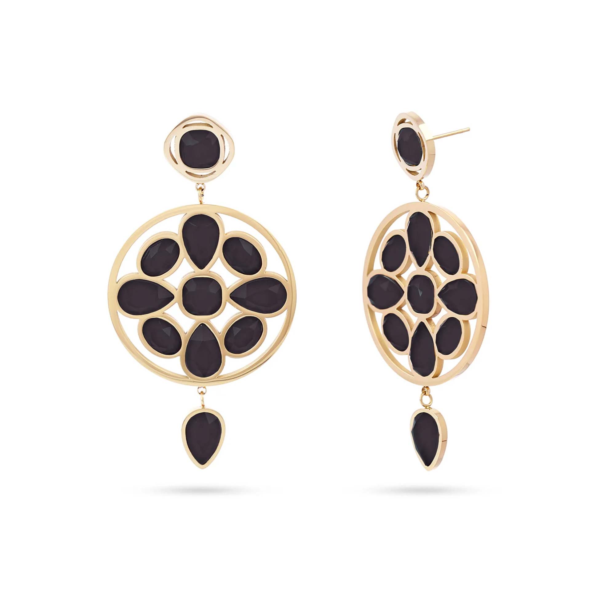Add to WishlistDeslumbrantes pendientes colgantes con un diseño audaz y elegante. Cada pendiente presenta una piedra ovalada negra en la parte superior, del que cuelga un gran aro calado. Dentro del aro, un patrón floral está formado por varias piedras en forma de lágrima. Una gema adicional en forma de lágrima cuelga de la parte inferior del aro. Unos accesorios llamativos y sofisticados, perfectos para ocasiones especiales.