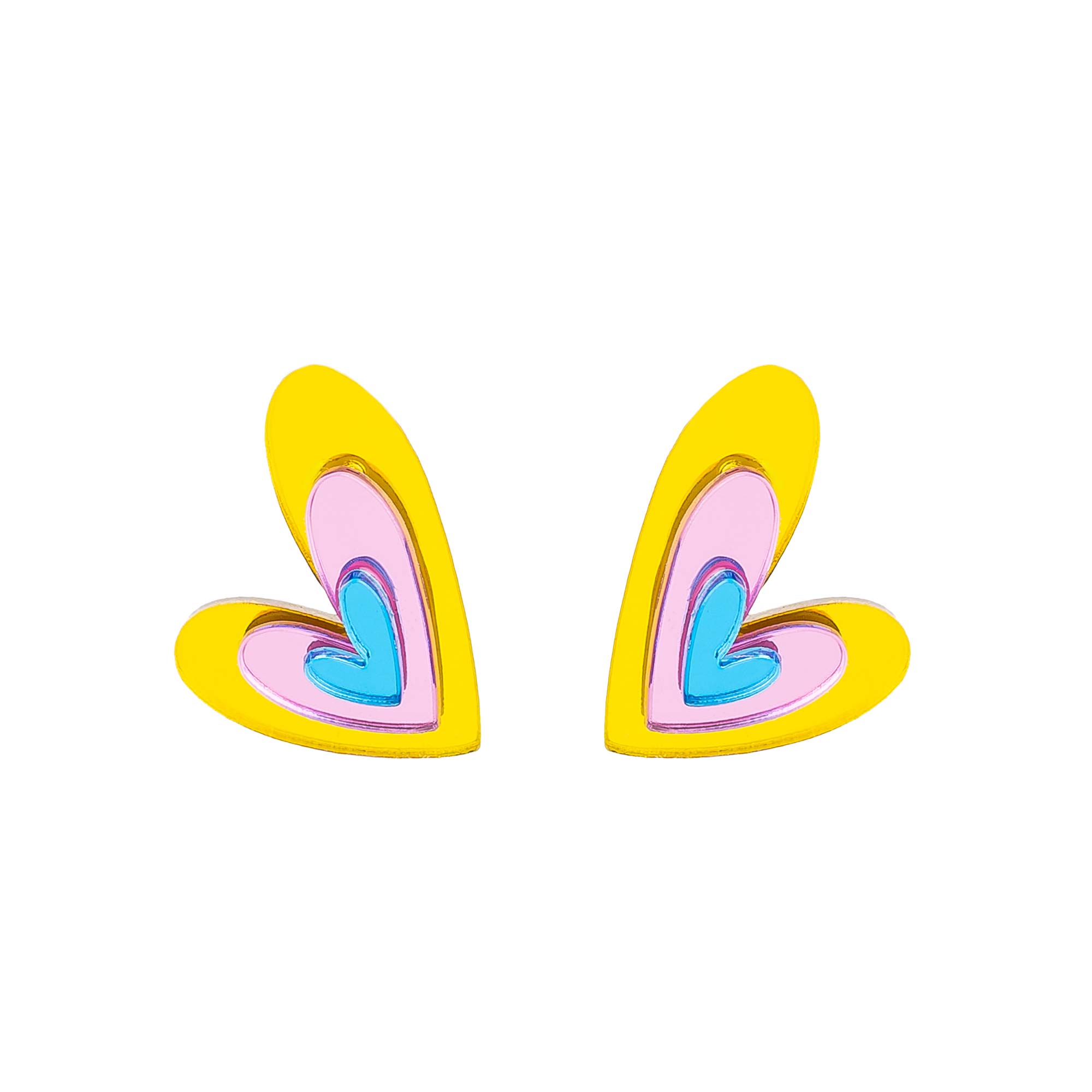Pendientes de metacrilato con forma de Corazón en acabado amarillo, rosa y azul. Efecto shiny/espejo. Cierre de presión.