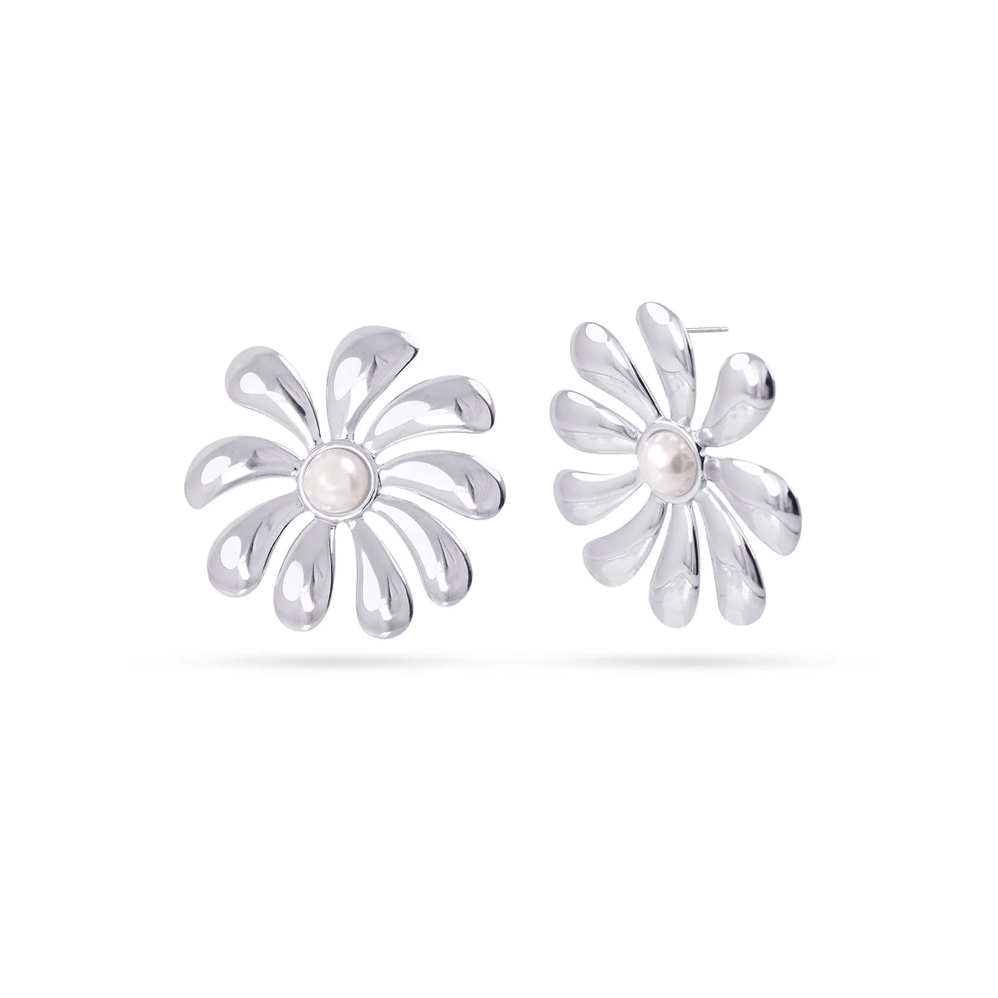 Radiantes pendientes con un diseño floral moderno y escultural. Cada pendiente presenta una flor de ocho pétalos curvados y pulidos, en cuyo centro se asienta una perla blanca iridiscente. Su acabado brillante y el contraste con la perla los convierten en un accesorio llamativo y elegante, perfecto para añadir un toque de frescura y sofisticación a tu look.