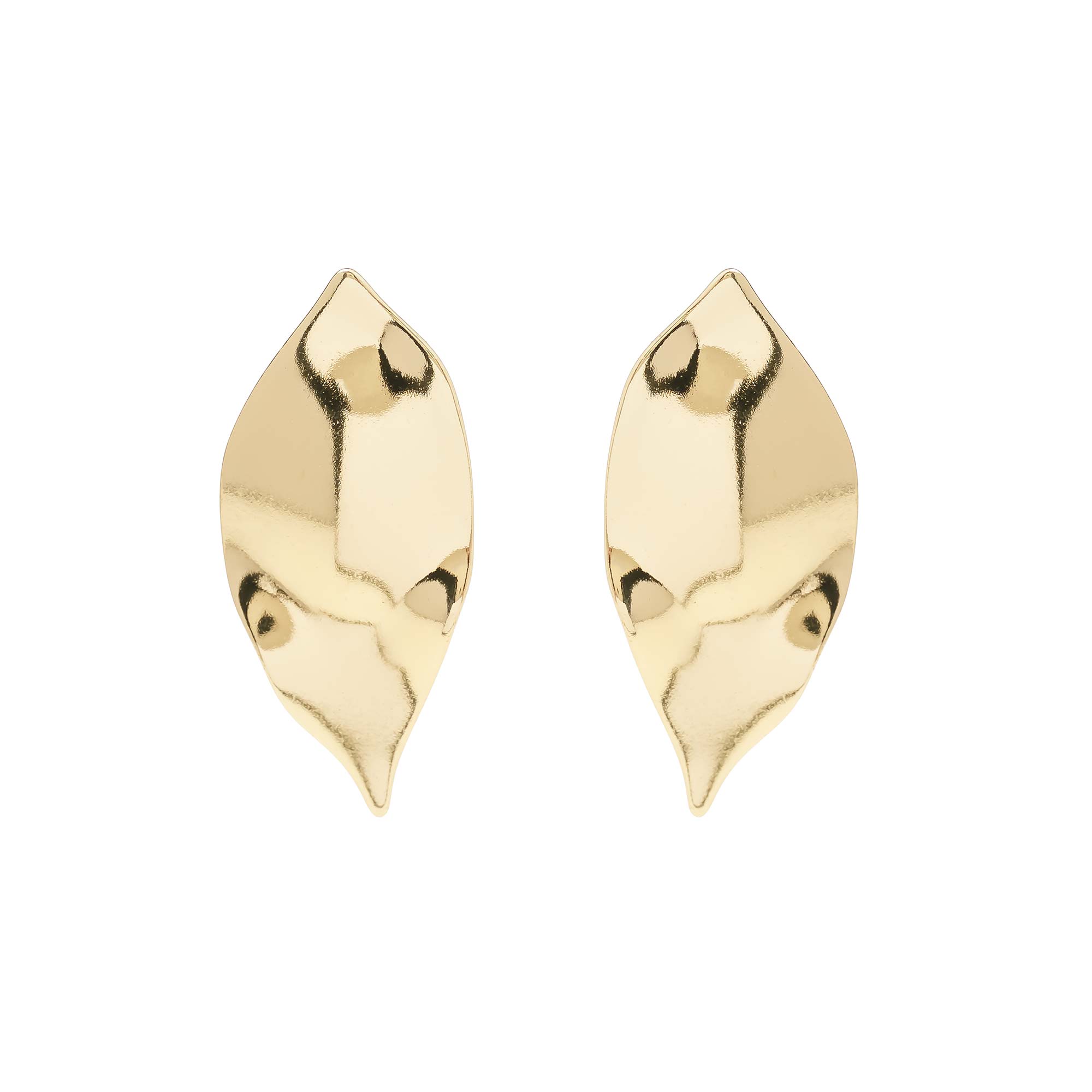 Elegantes pendientes tipo botón con un diseño en forma de hoja, de acabado pulido y brillante. La superficie presenta sutiles ondulaciones o abolladuras que reflejan la luz de manera interesante, creando un efecto texturizado. Un accesorio moderno y versátil, perfecto para añadir un toque de brillo y estilo orgánico a cualquier conjunto.