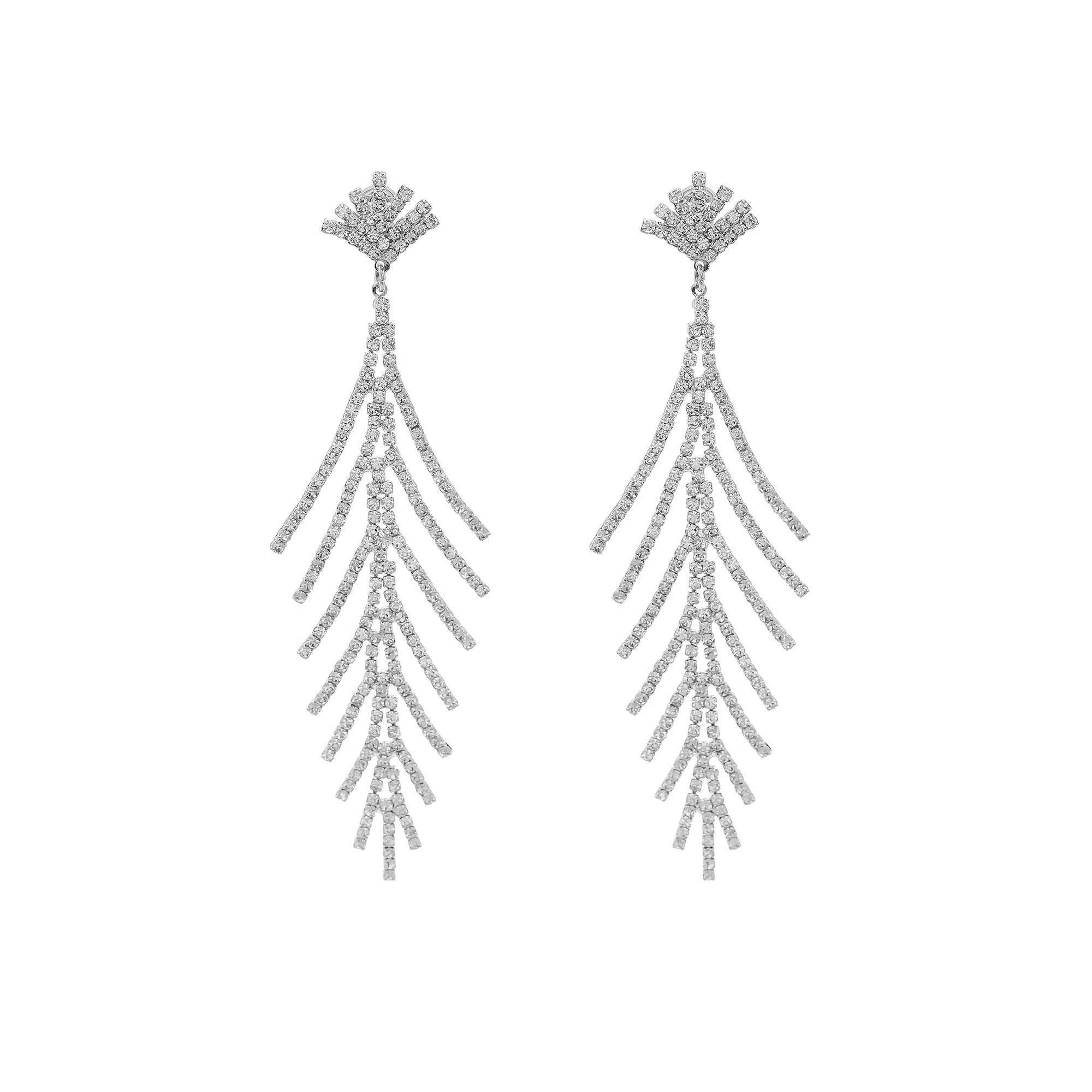 Pendientes largos de diseño botánico con ramificaciones en cascada y una base superior en abanico, totalmente decorados con circonitas.