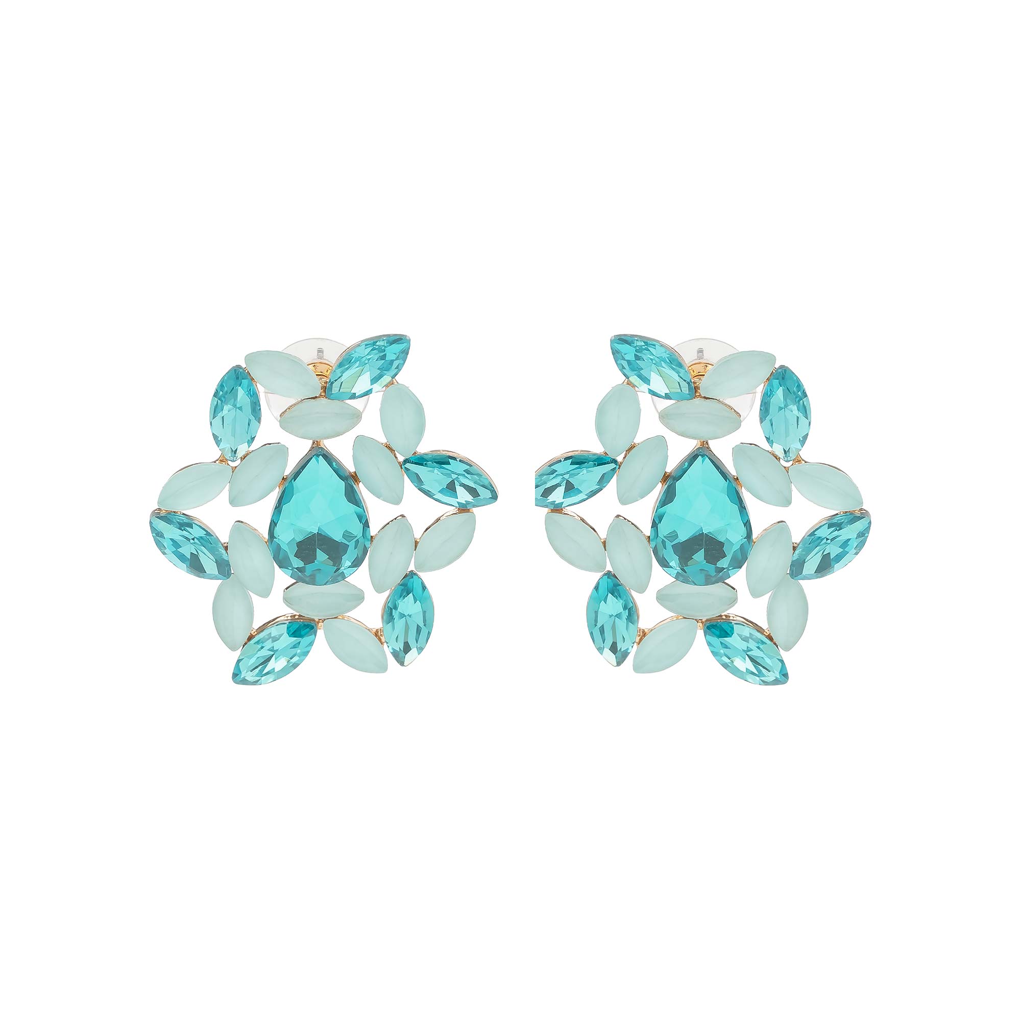 Add to WishlistRadiantes pendientes tipo botón con un diseño floral o de racimo de gemas. Cada pendiente presenta una gema central grande en forma de lágrima, de un vibrante color aguamarina, rodeada por múltiples piedras facetadas en forma de hoja en tonos de azul claro y aguamarina más intenso. Son el accesorio ideal para aportar un toque de frescura y sofisticación a tu look, perfectos para eventos especiales.