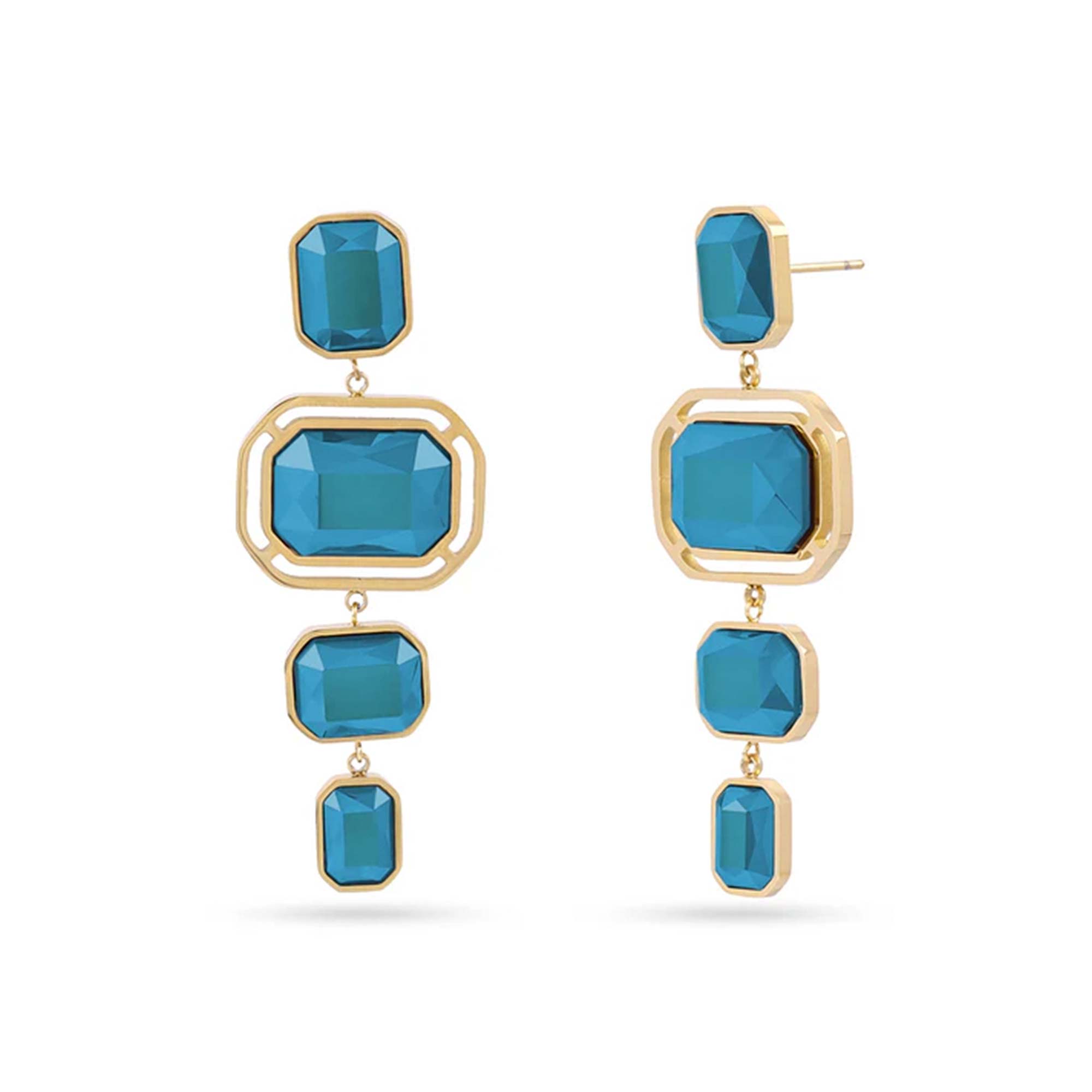 Add to WishlistEstos impresionantes pendientes largos son una verdadera declaración de estilo, combinando la elegancia con la frescura del turquesa. Cada pendiente presenta una secuencia de cuatro cristales facetados de forma rectangular en un vibrante tono turquesa. La distribución de los cristales crea un diseño escalonado y dinámico: un cristal superior más pequeño, seguido de uno más grande enmarcado con un borde dorado, y luego dos cristales más pequeños que cuelgan delicadamente. Esta disposición añade movimiento y un brillo excepcional a cada pieza. Perfectos para realzar un look de noche, añadir un toque sofisticado a un atuendo festivo o simplemente para quienes aman destacar con joyas únicas y llamativas. Colección Anartxy.