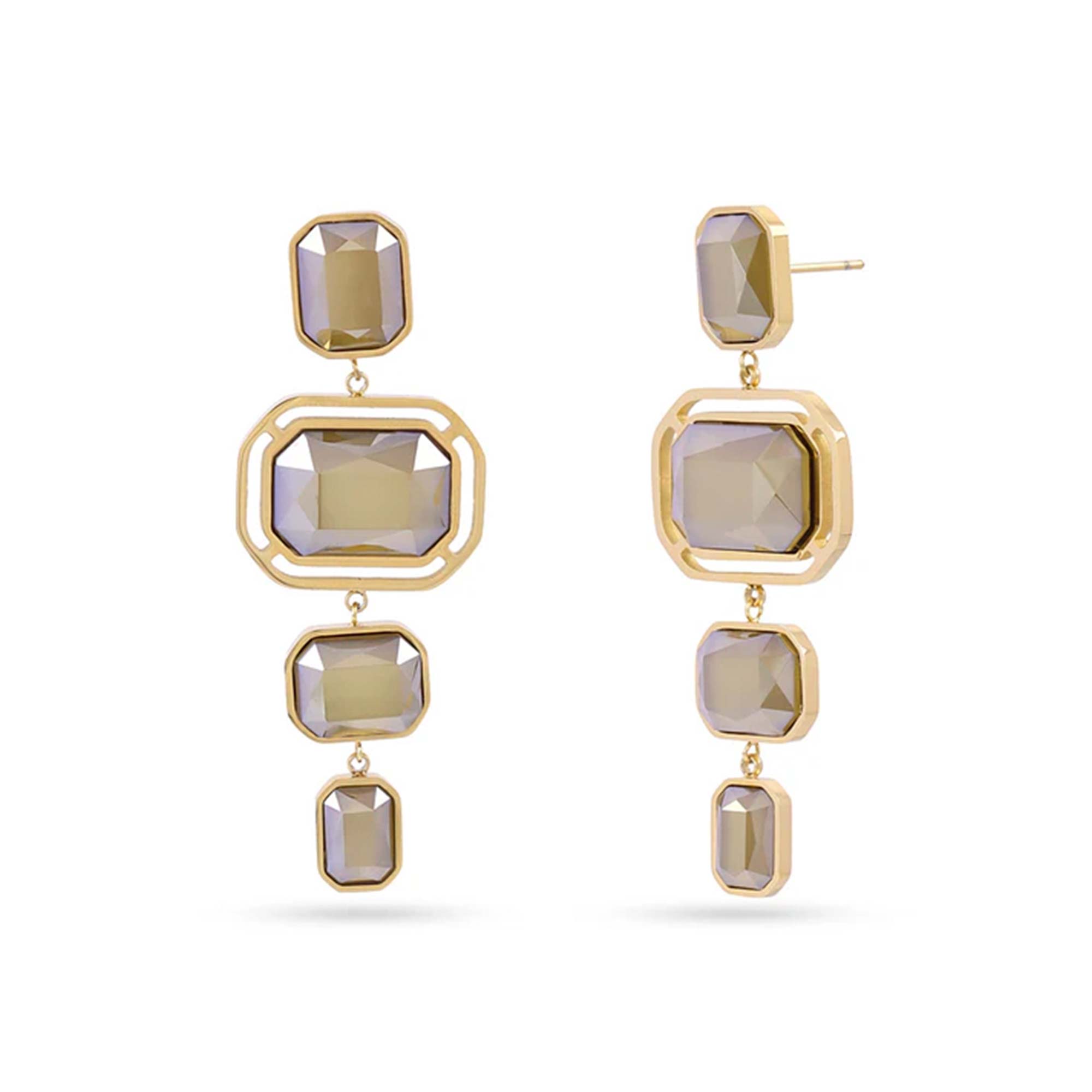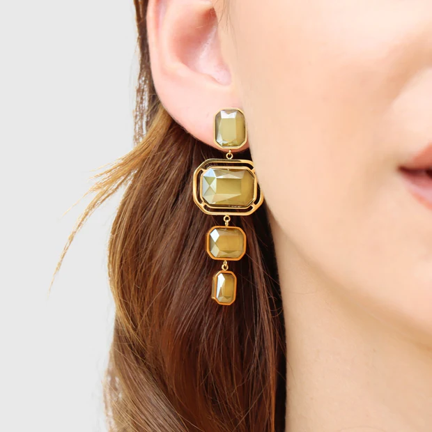 Estos impresionantes pendientes largos son una verdadera declaración de estilo, combinando la elegancia con la frescura del laurel. Cada pendiente presenta una secuencia de cuatro cristales facetados de forma rectangular en un vibrante tono turquesa. La distribución de los cristales crea un diseño escalonado y dinámico: un cristal superior más pequeño, seguido de uno más grande enmarcado con un borde dorado, y luego dos cristales más pequeños que cuelgan delicadamente. Esta disposición añade movimiento y un brillo excepcional a cada pieza. Perfectos para realzar un look de noche, añadir un toque sofisticado a un atuendo festivo o simplemente para quienes aman destacar con joyas únicas y llamativas. Colección Anartxy.