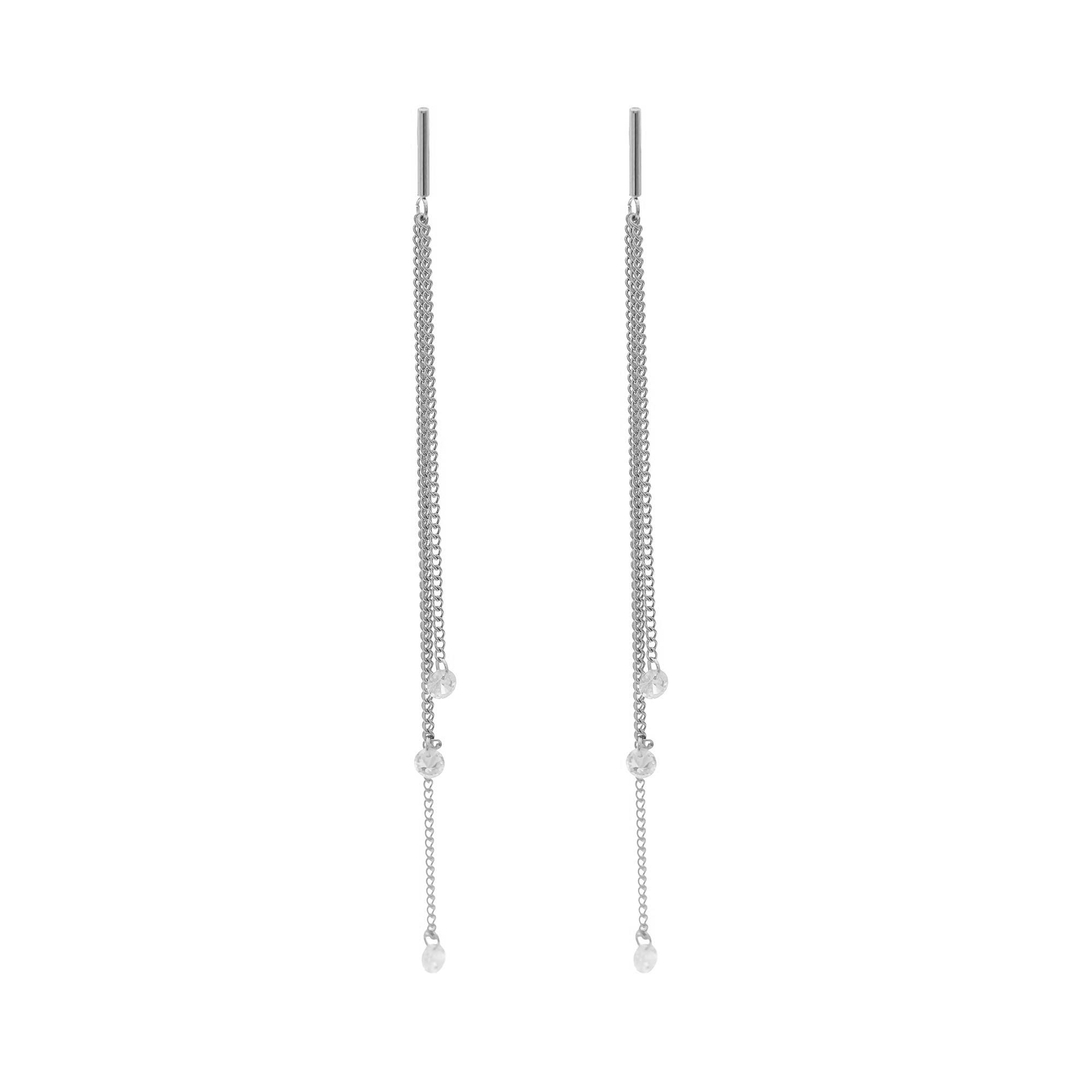 Add to WishlistPendientes largos compuestos por una barra lisa superior de la que cuelgan varias cadenas finas de distintas longitudes rematadas con pequeñas piedras.