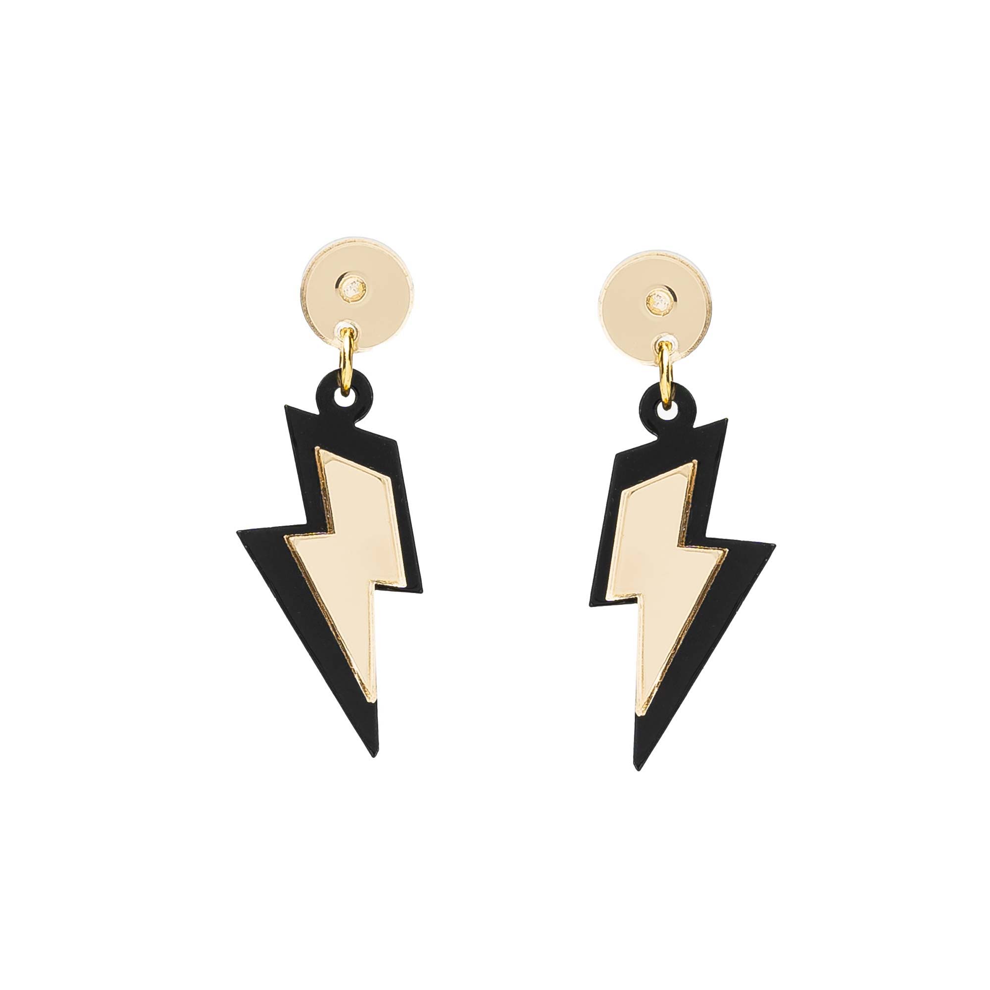 Add to WishlistPendientes de metacrilato con forma de mini rayo dorado y negro. Efecto shiny/espejo. Cierre de presión.