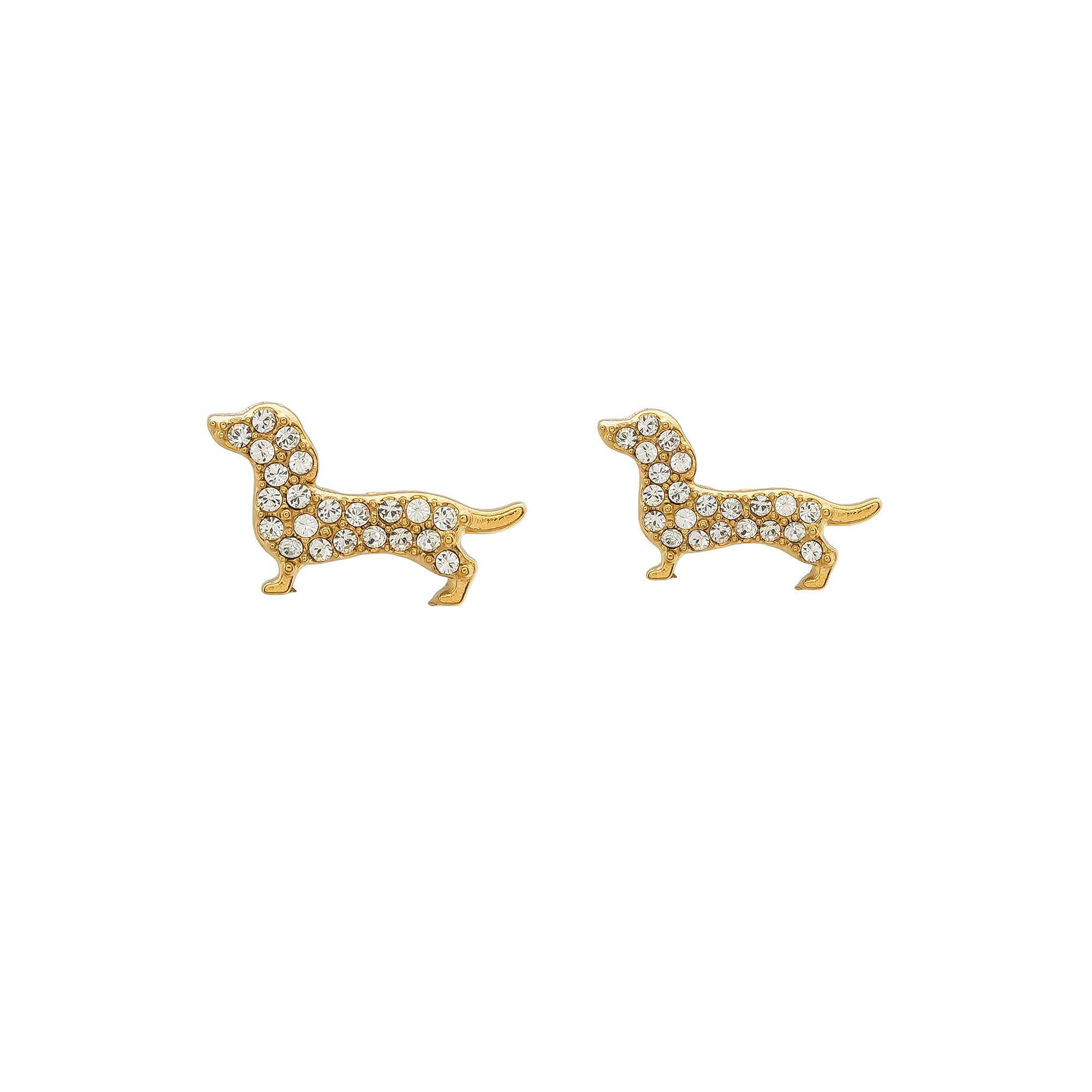 Divertidos pendientes con silueta de perro salchicha totalmente cubiertos de circonitas brillantes.